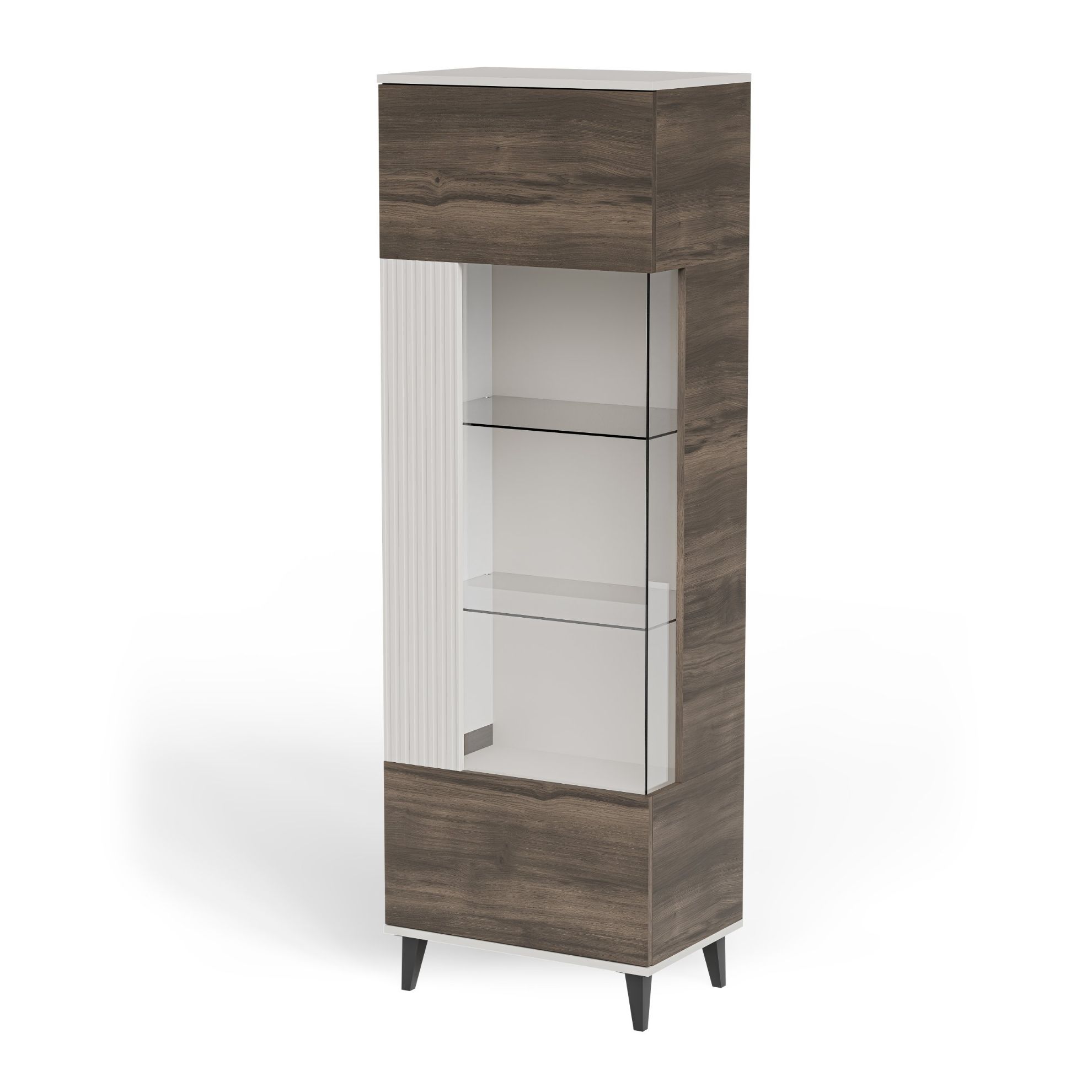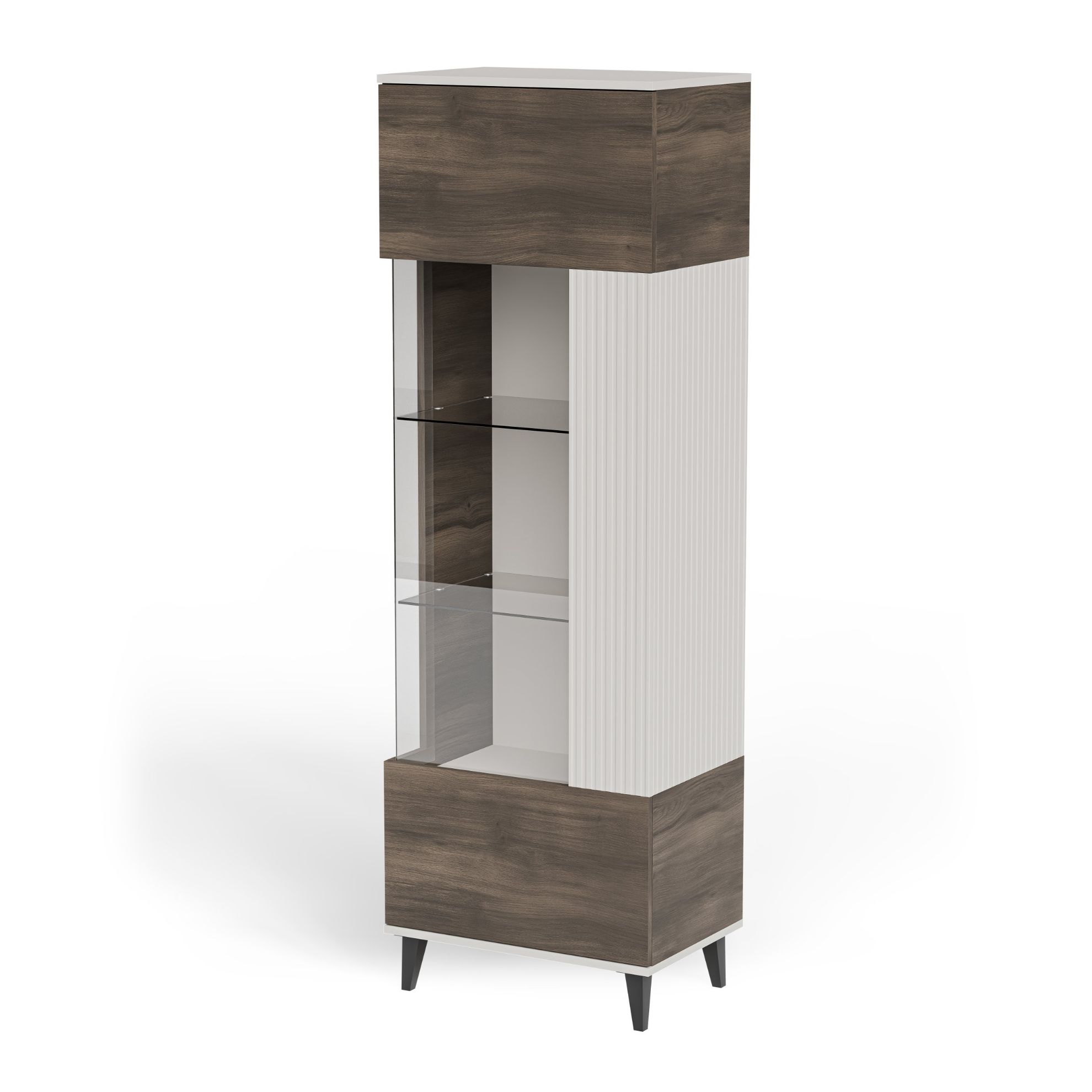 Witryna Felicjan to stylowy i praktyczny mebel, który doskonale uzupełnia aranżację nowoczesnych oraz klasycznych wnętrz. Dzięki wymiarom 60/40/182 cm witryna świetnie sprawdzi się zarówno w większych, jak i bardziej kompaktowych pomieszczeniach, oferując wygodne miejsce do przechowywania oraz ekspozycji dekoracji, zastawy stołowej czy książek. Połączenie modnych kolorów kaszmir, orzech oraz czarny tworzy harmonijną i elegancką kompozycję, która przyciąga wzrok i podkreśla charakter pomieszczenia. Witryna do salonu Felicjan została wykonana z wysokiej jakości materiałów, takich jak MDF okleinowany, płyta meblowa okleinowana oraz elementy z polipropylenu, co zapewnia trwałość oraz estetyczne wykończenie powierzchni.