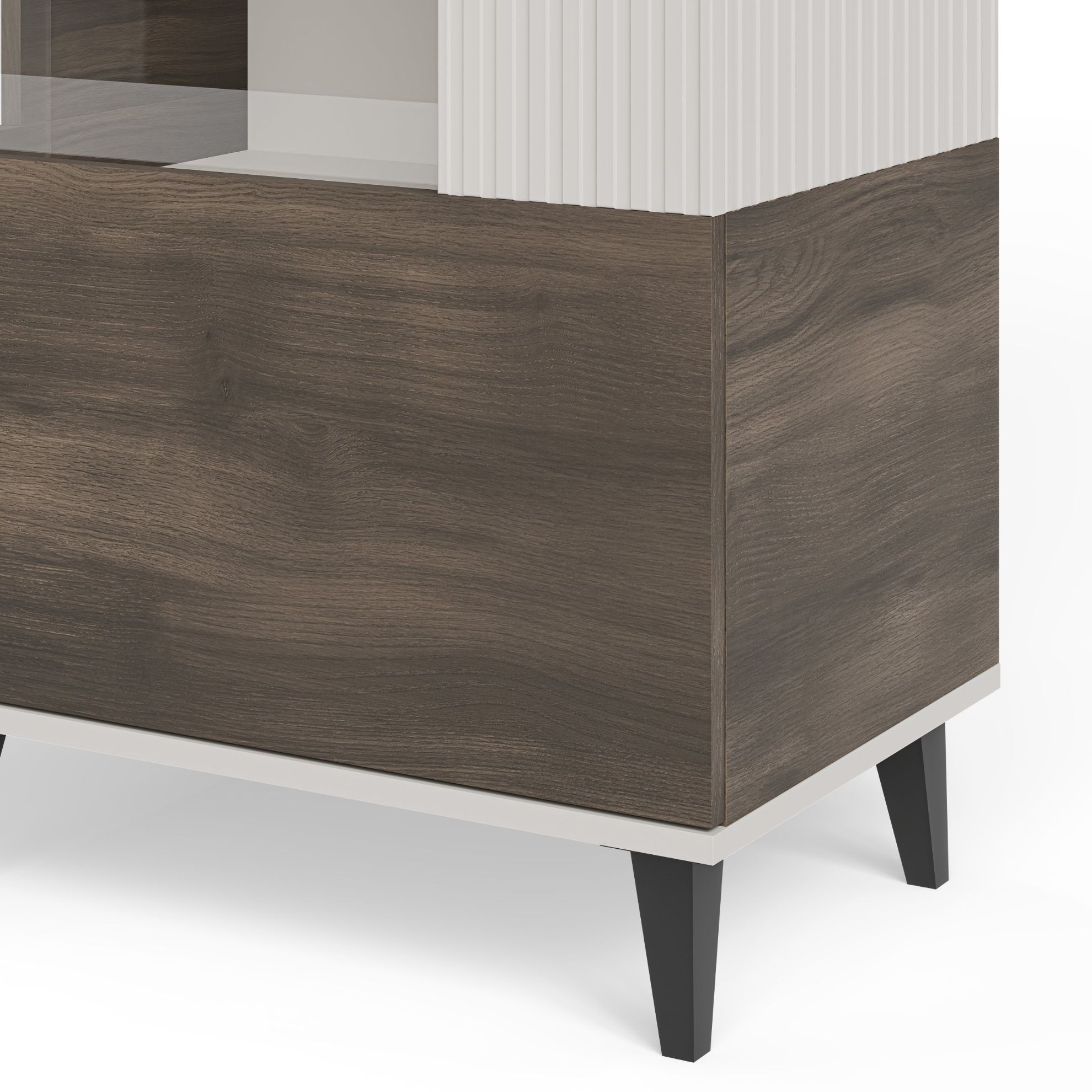 Nowoczesna witryna Felicjan wyróżnia się starannie dobranymi materiałami, które gwarantują odporność na codzienne użytkowanie. MDF okleinowany oraz płyta meblowa okleinowana charakteryzują się zwiększoną odpornością na zarysowania i wilgoć, dzięki czemu witryna zachowuje estetyczny wygląd przez długi czas. Zastosowanie polipropylenu wpływa na trwałość detali konstrukcyjnych oraz stabilność całej bryły. Kolor kaszmir w połączeniu z ciepłym odcieniem orzecha i kontrastującą czernią tworzy efektowną kompozycję, która doskonale wpisuje się w aktualne trendy wnętrzarskie. Witryna na nóżkach prezentuje się lekko i elegancko, a jednocześnie ułatwia utrzymanie porządku pod meblem.
