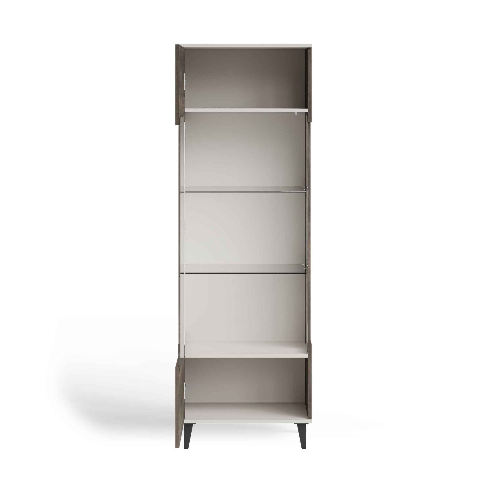 Witryna z półkami Felicjan została zaprojektowana z myślą o wygodnym przechowywaniu różnorodnych przedmiotów. Funkcjonalne półki pozwalają na uporządkowanie dekoracji, szkła, dokumentów czy kolekcji książek. Drzwi uchylne zapewniają łatwy dostęp do wnętrza mebla oraz skutecznie chronią zawartość przed kurzem. Przemyślany układ wnętrza sprawia, że witryna doskonale sprawdza się jako witryna do jadalni, witryna do salonu lub elegancka witryna do gabinetu. Smukła konstrukcja sprawia, że mebel nie przytłacza przestrzeni, jednocześnie oferując dużą pojemność przechowywania.