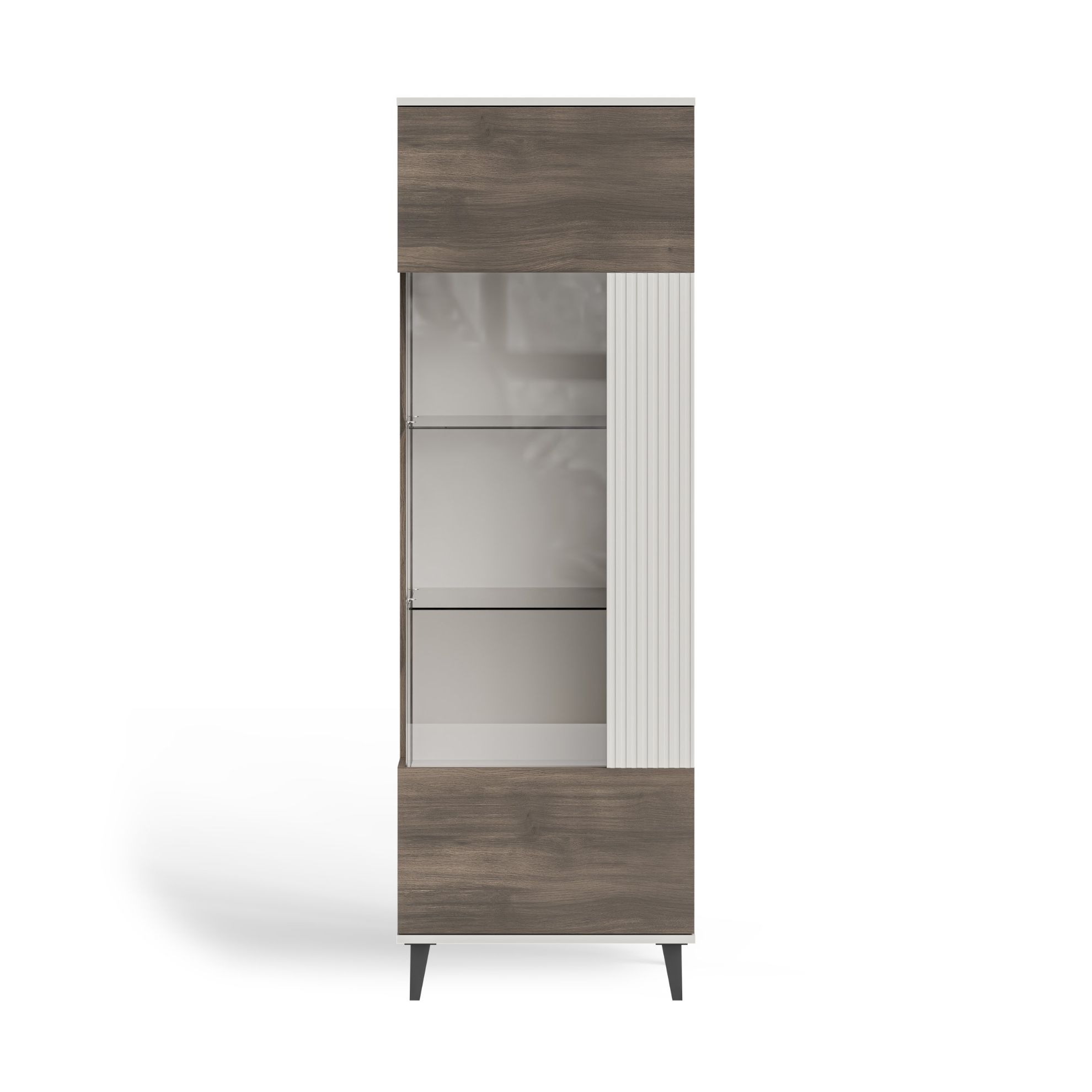Witryna Felicjan na nóżkach to rozwiązanie, które nadaje bryle wizualnej lekkości i podkreśla nowoczesny styl mebla. Podwyższona konstrukcja nie tylko wpływa na estetykę, ale również poprawia komfort użytkowania oraz ułatwia sprzątanie. Dzięki uniwersalnej kolorystyce kaszmir–orzech–czarny witryna doskonale komponuje się z różnymi aranżacjami wnętrz, od minimalistycznych po bardziej dekoracyjne. Witryna Felicjan to doskonały wybór dla osób poszukujących stylowego mebla do przechowywania, który łączy estetykę z funkcjonalnością i trwałością.