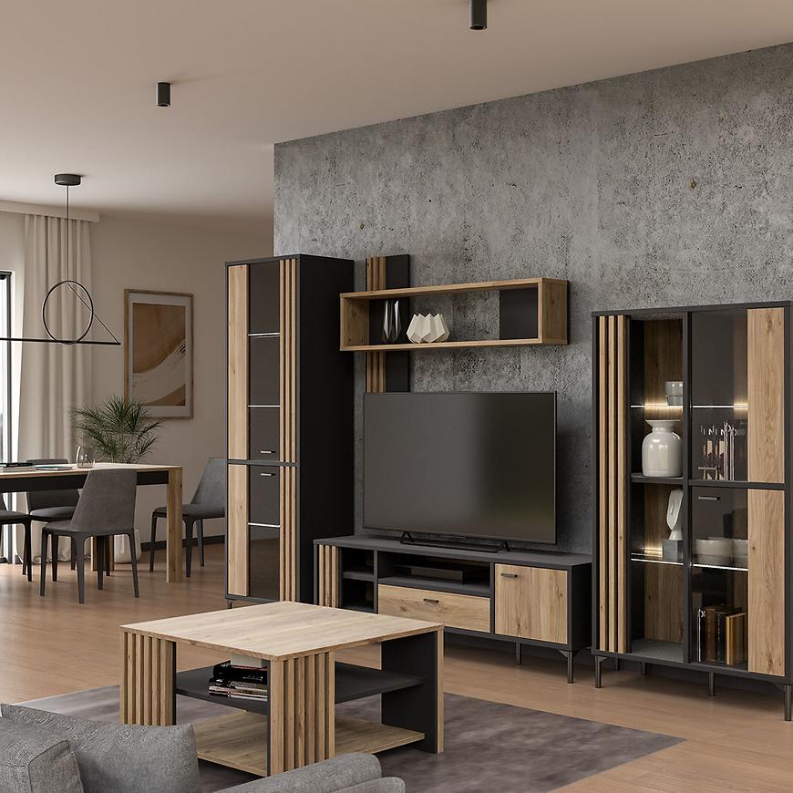 Witryna Figila prezentuje się efektownie dzięki połączeniu kolorów. Kolor frontów w odcieniu dąb mauvella w połączeniu z czernią nadaje jej elegancji i nowoczesnego wyrazu. Zarówno fronty, jak i korpus witryny są pokryte matową powłoką, co dodaje jej wyjątkowego charakteru. Konstrukcja frontów i korpusu wykonana jest z trwałej płyty wiórowej laminowanej, gwarantując solidność i długotrwałość.