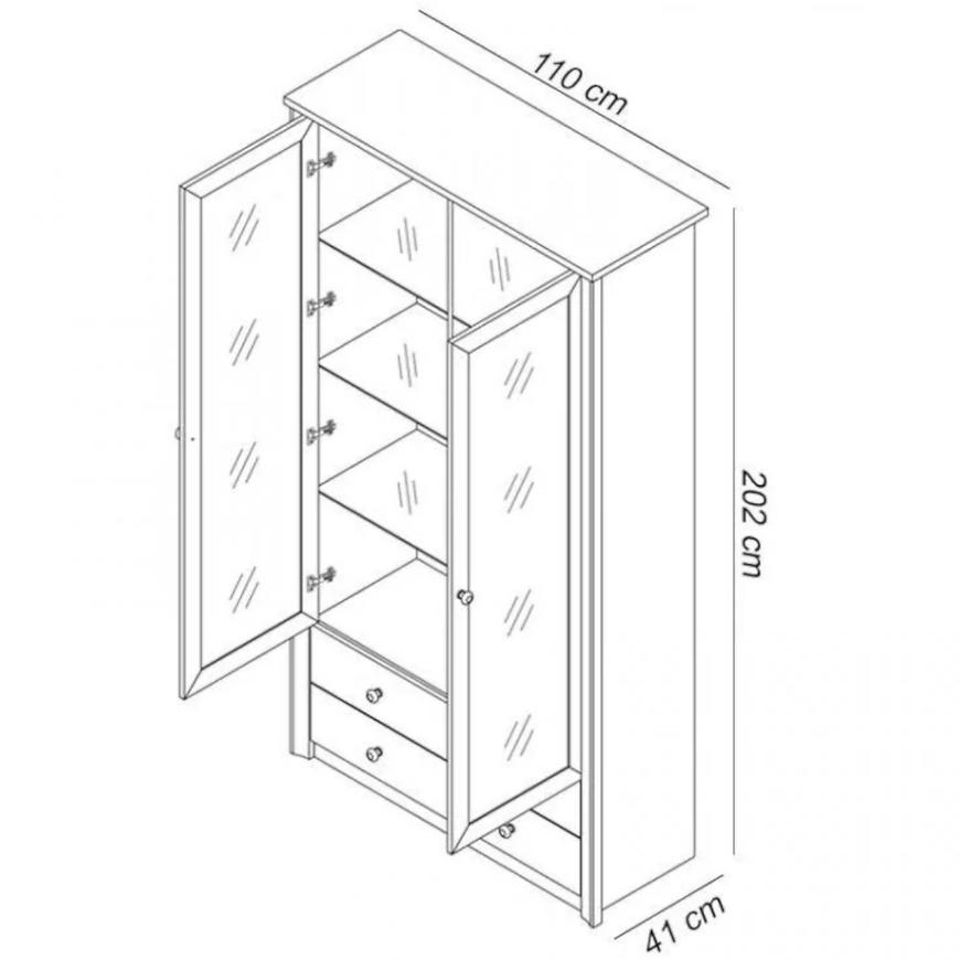 Mebel ma imponujące wymiary: 202 cm wysokości, 110 cm szerokości i 41 cm głębokości, co sprawia, że jest doskonałym rozwiązaniem do przechowywania i wyeksponowania różnych przedmiotów. Posiada dwudrzwiowe fronty o jasnym drewnopodobnym kolorze, które nadają mu klasycznego wyglądu. Fronty witryny wykonane są z płyty wiórowej laminowanej i mają matowe wykończenie, co dodaje meblowi elegancji. Korpus witryny również utrzymany jest w jasnym drewnopodobnym kolorze.