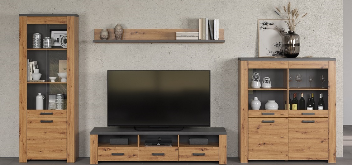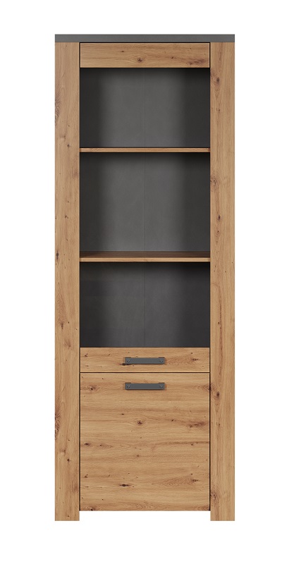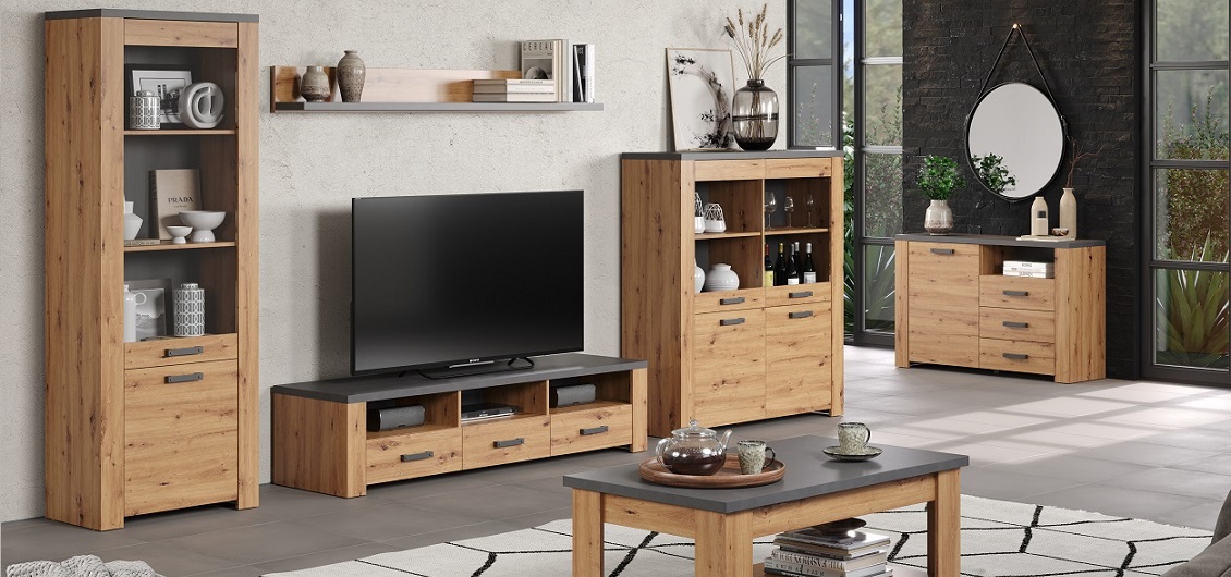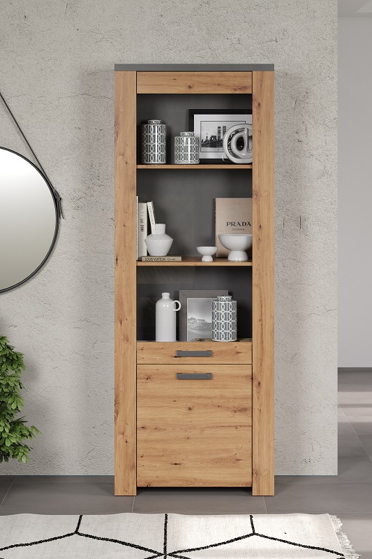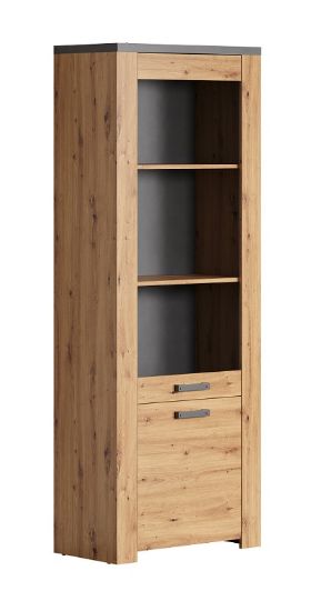 Najwyższa jakość materiałów użytych do produkcji sprawia, że witryna jest nie tylko estetyczna, ale również trwała. Wykonana z wysokiej jakości płyty meblowej laminowanej, w kolorze dąb artisan/matera w matowym wykończeniu, prezentuje się wyjątkowo nowocześnie. Kolorystyka nadaje wnętrzu ciepła, jednocześnie doskonale komponując się z różnymi stylami aranżacyjnymi.