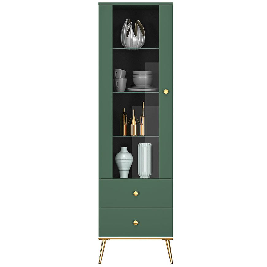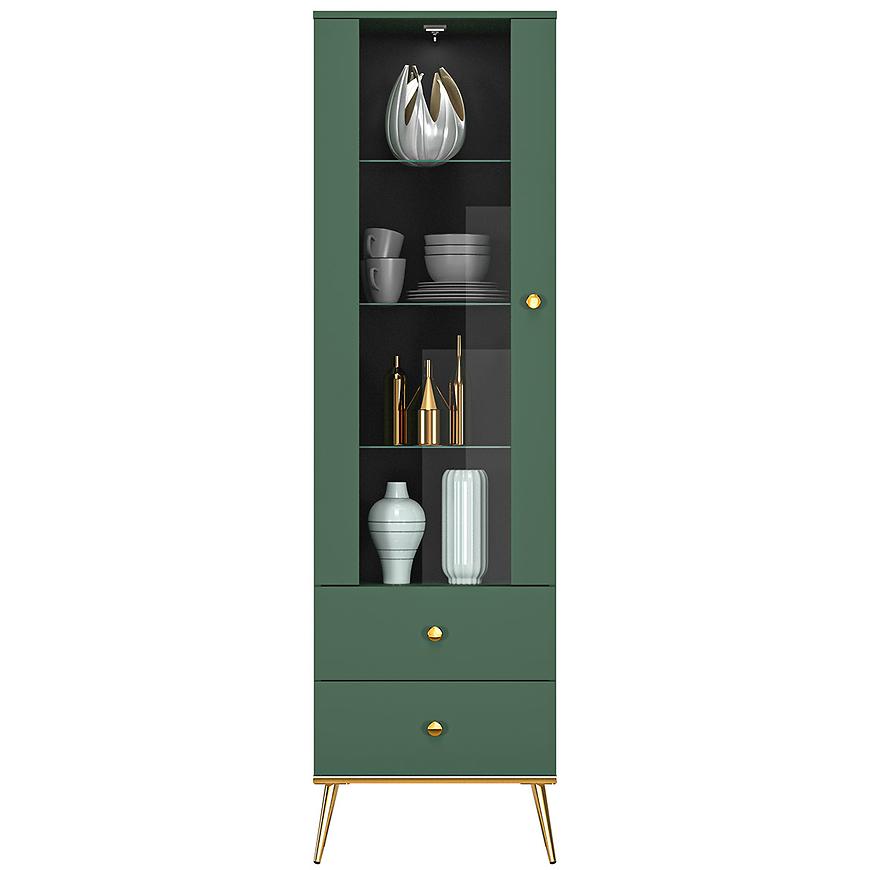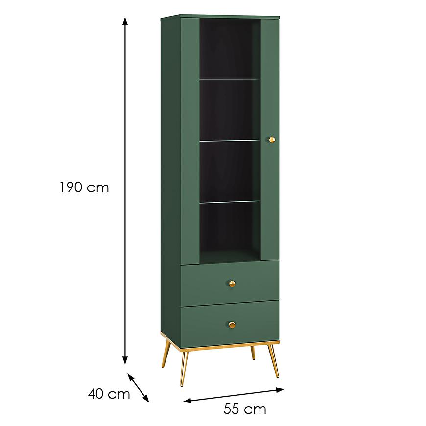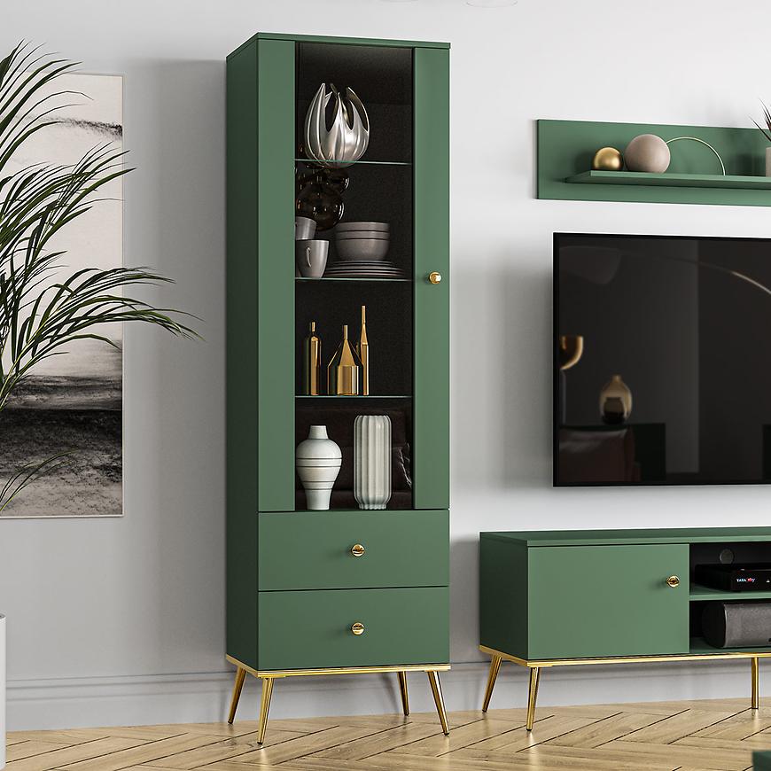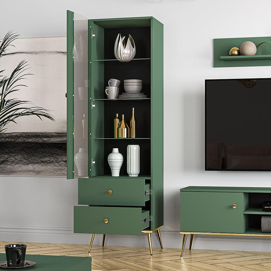 Witryna Forest to idealny wybór do salonu, jadalni czy gabinetu. Doskonale sprawdzi się jako miejsce do przechowywania i eksponowania dekoracji, książek czy zastawy stołowej. Jej nowoczesny design i zielona kolorystyka wprowadzą do wnętrza elegancję i świeżość, stając się centralnym punktem każdego pomieszczenia.