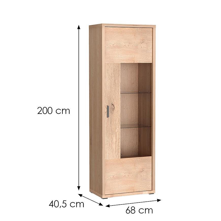 Witryna Grande G4 Dąb Cremona to nowoczesny mebel o wysokości 200 cm, wykonany z laminowanej płyty wiórowej w ciepłym, jasnym odcieniu dębu cremona. Jednodrzwiowa konstrukcja z czterema półkami zapewnia praktyczne miejsce do ekspozycji i przechowywania. Matowe wykończenie dodaje elegancji, a opcjonalne oświetlenie LED podkreśla charakter wnętrza. Idealna do salonu lub jadalni w stylu nowoczesnym. Produkt wymaga samodzielnego montażu.