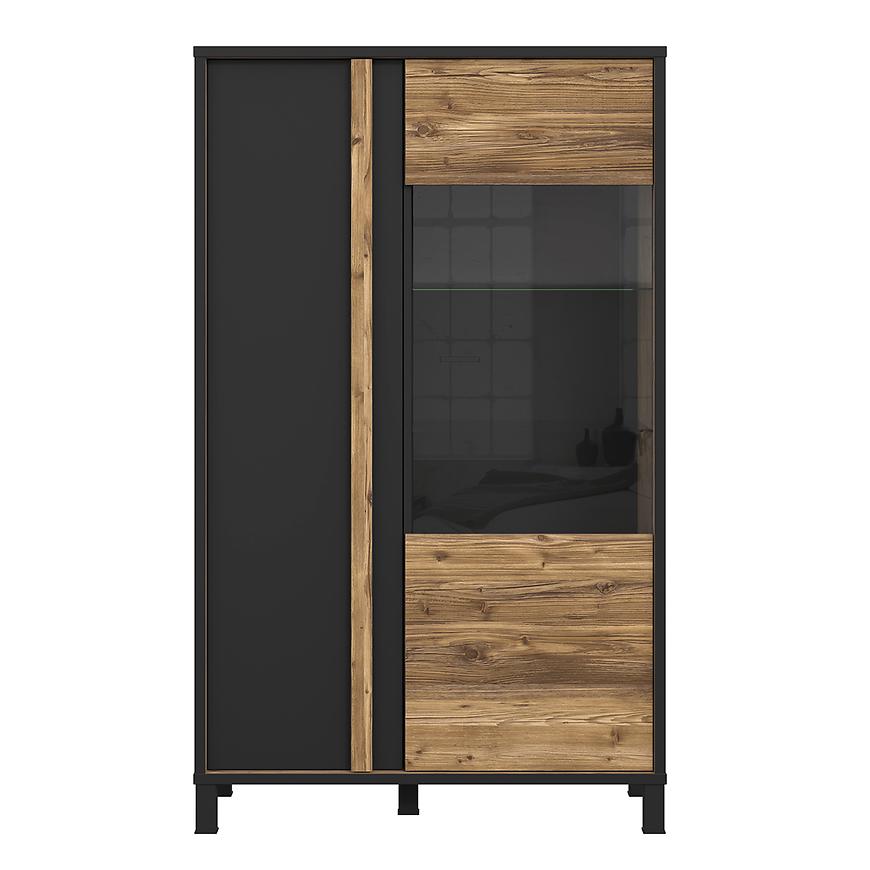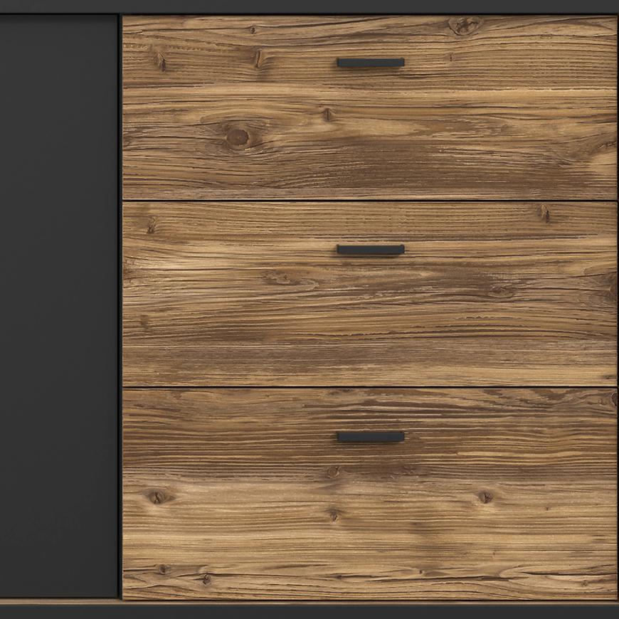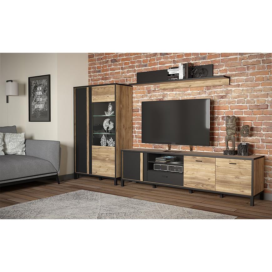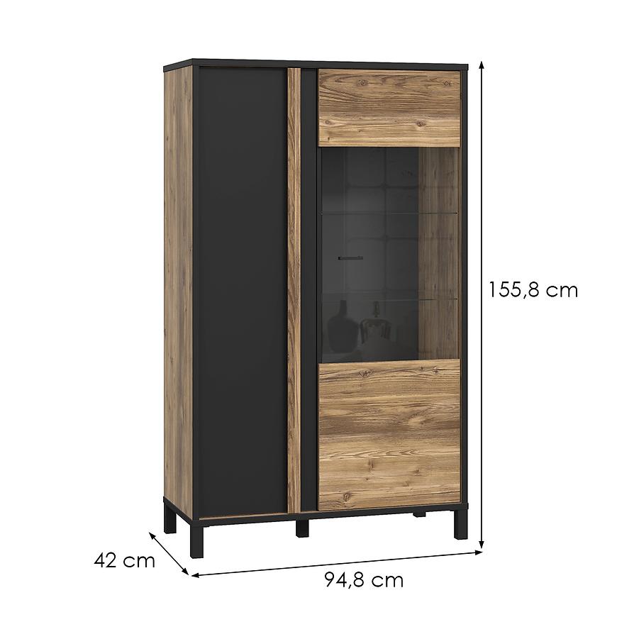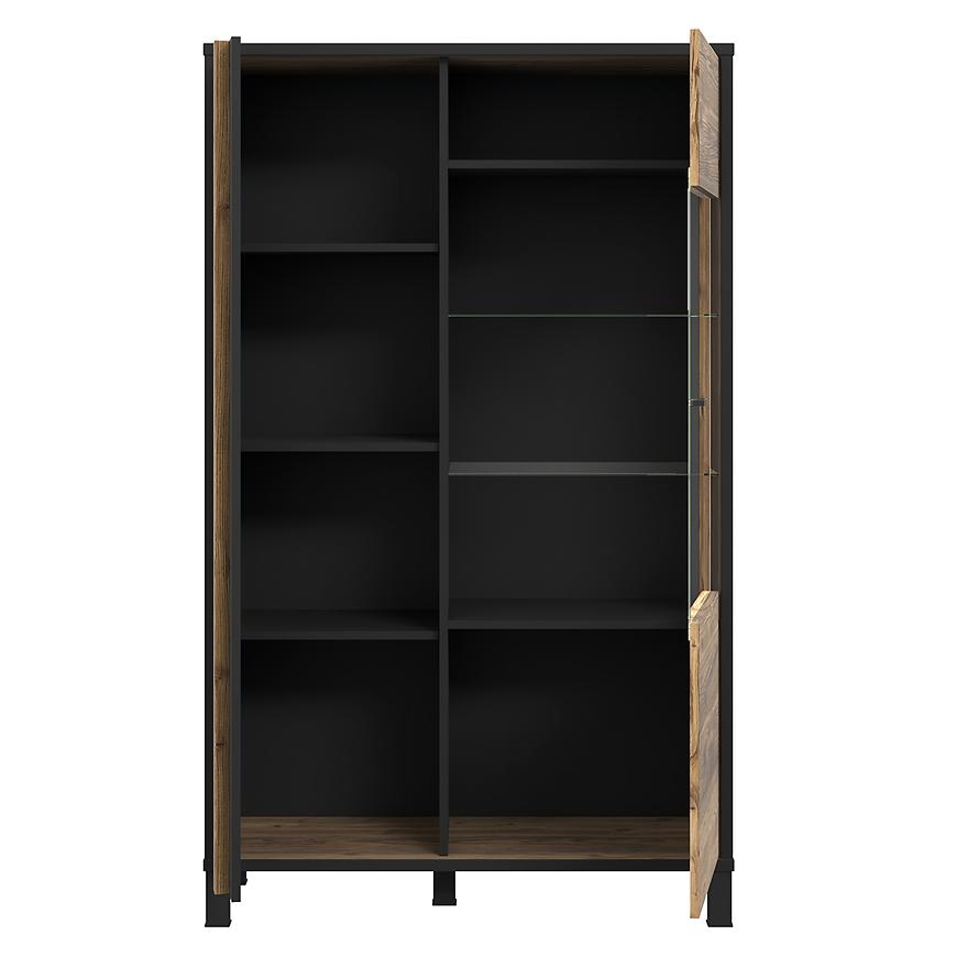 Witryna Haruki wyróżnia się wyjątkowym wykończeniem. Dekor w odcieniu świerka alpejskiego w połączeniu z czernią tworzą efektowny kontrast, który przyciąga uwagę i nadaje meblowi nowoczesnego charakteru. Zarówno fronty, jak i korpus witryny są wykończone matową powłoką, co dodaje meblom elegancji i trwałości.