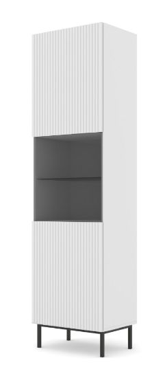 Korpus witryny, wykonany z trwałej płyty laminowanej w białym matowym kolorze, nadaje meblowi lekkości i uniwersalności. Fronty z płyty MDF frezowanej folią w białym matowym wykończeniu dodają elegancji i nowoczesnego charakteru.