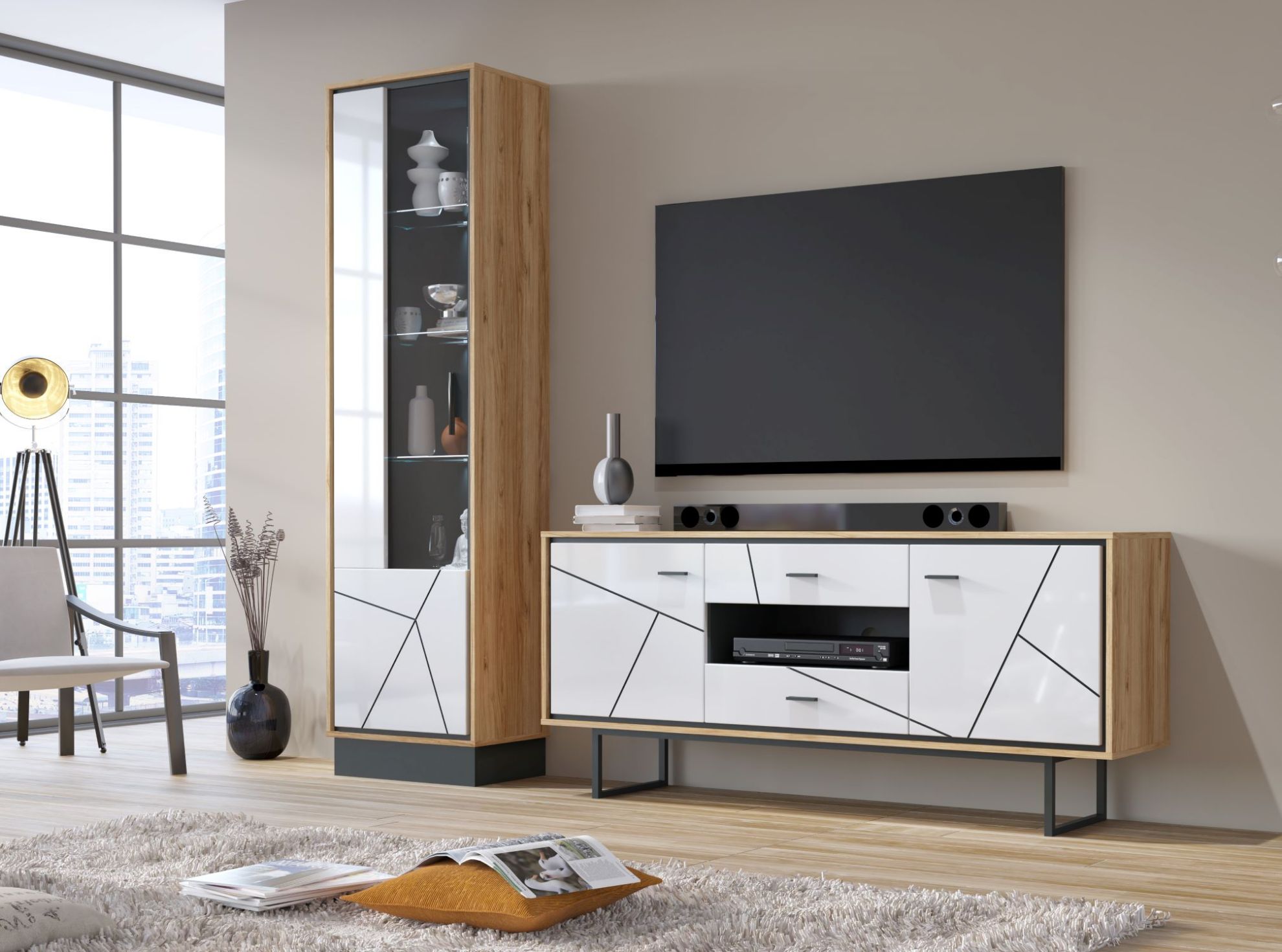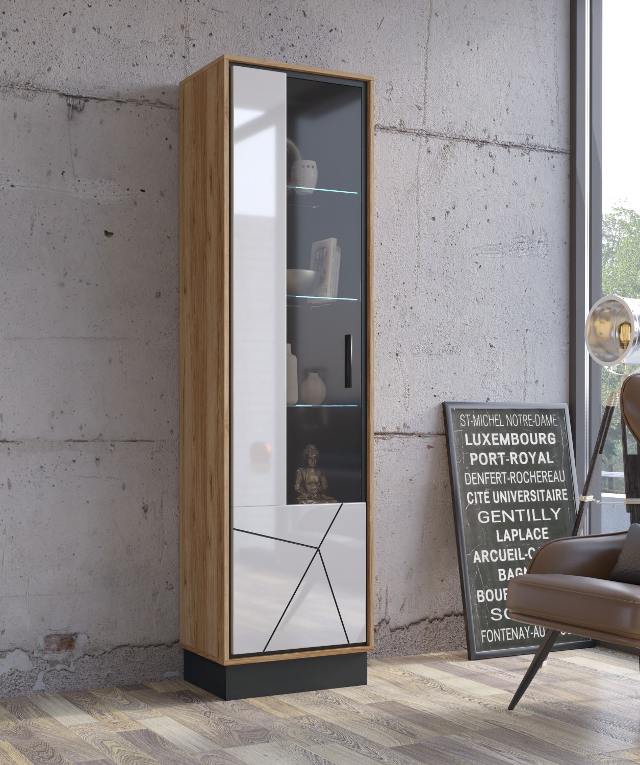 Witryna jednodrzwiowa lewa Brolo Typ BROV01L to elegancki mebel zaprojektowany z myślą o nowoczesnych wnętrzach salonu i jadalni. Charakterystyczne połączenie błyszczących białych frontów z ciepłym dekorem drewna sprawia, że mebel wprowadza do pomieszczenia przytulny klimat, jednocześnie zachowując nowoczesny charakter. Witryna idealnie wpisuje się w estetykę kolekcji Brolo, łącząc minimalizm z elegancją.