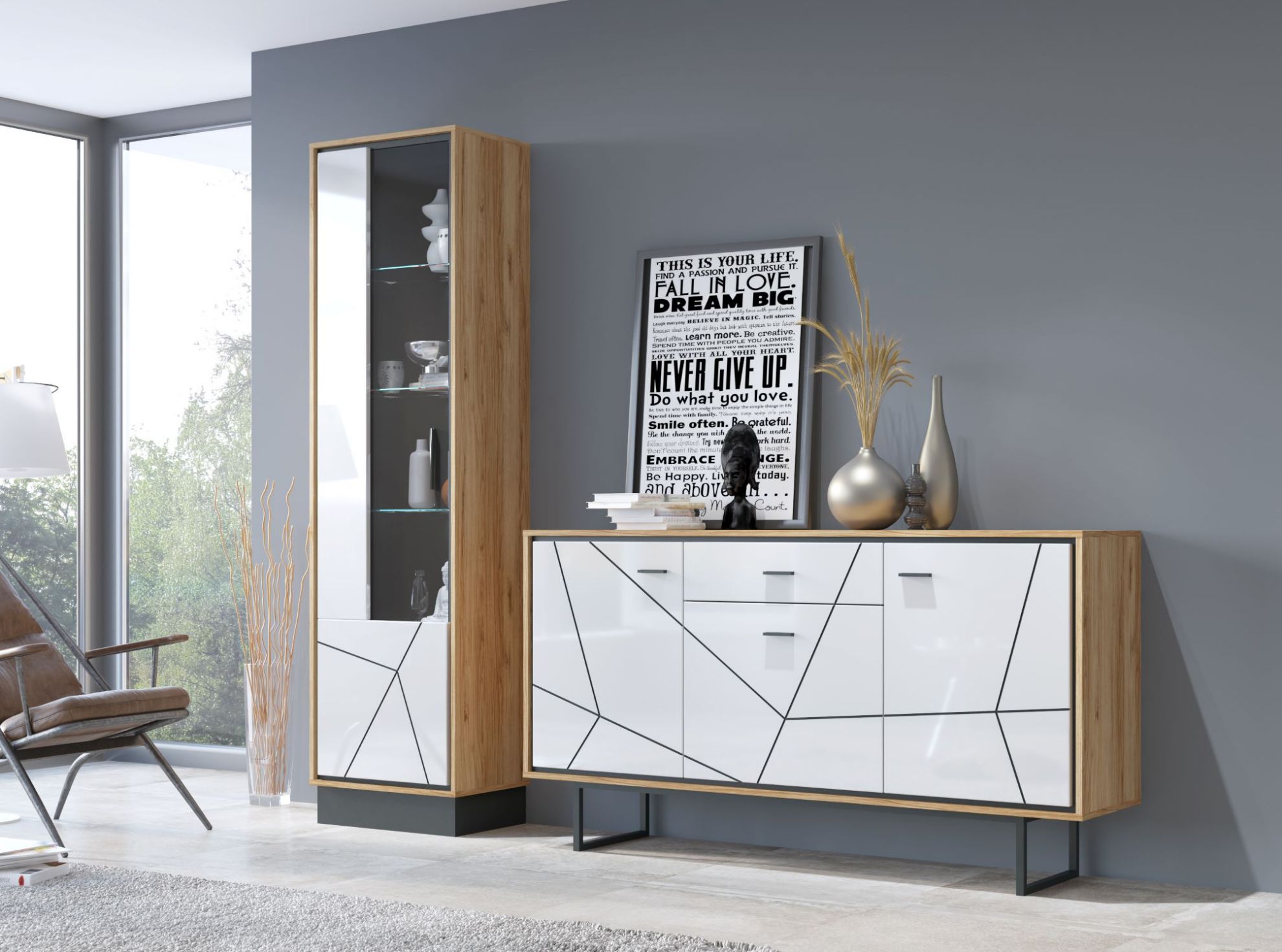 Kolekcja mebli Brolo to propozycja dla osób, które cenią nowoczesny design, elegancję i praktyczne rozwiązania w codziennym użytkowaniu. Każdy element kolekcji, od stołów i stolików po komody, witryny i półki, został zaprojektowany tak, aby wnosić do wnętrza harmonię, lekkość i przytulny charakter, jednocześnie zachowując nowoczesną estetykę. Charakterystyczne dla Brolo połączenie białych, błyszczących frontów z ciepłym drewnianym dekorem korpusu tworzy wyjątkowy efekt wizualny, który przyciąga wzrok i nadaje wnętrzom eleganckiego charakteru.