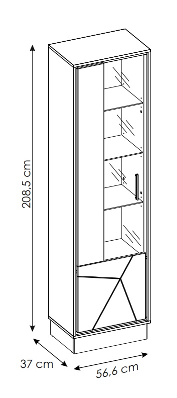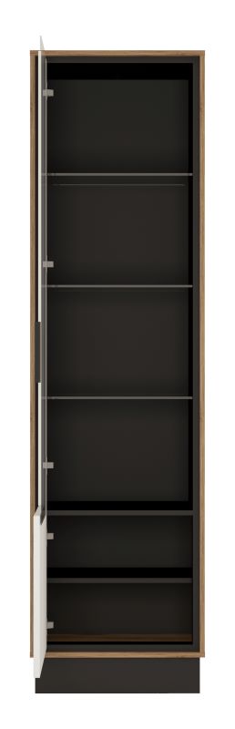 Wnętrze witryny zostało wyposażone w szklane półki z hartowanego szkła Antisol, które umożliwiają efektowne wyeksponowanie dekoracji, szkła lub porcelany. Regulacja wysokości półek pozwala dopasować przestrzeń do własnych potrzeb, zapewniając maksymalną funkcjonalność. Dodatkowo zawiasy z cichym domykiem podnoszą komfort użytkowania, chroniąc fronty przed trzaskaniem i uszkodzeniem.