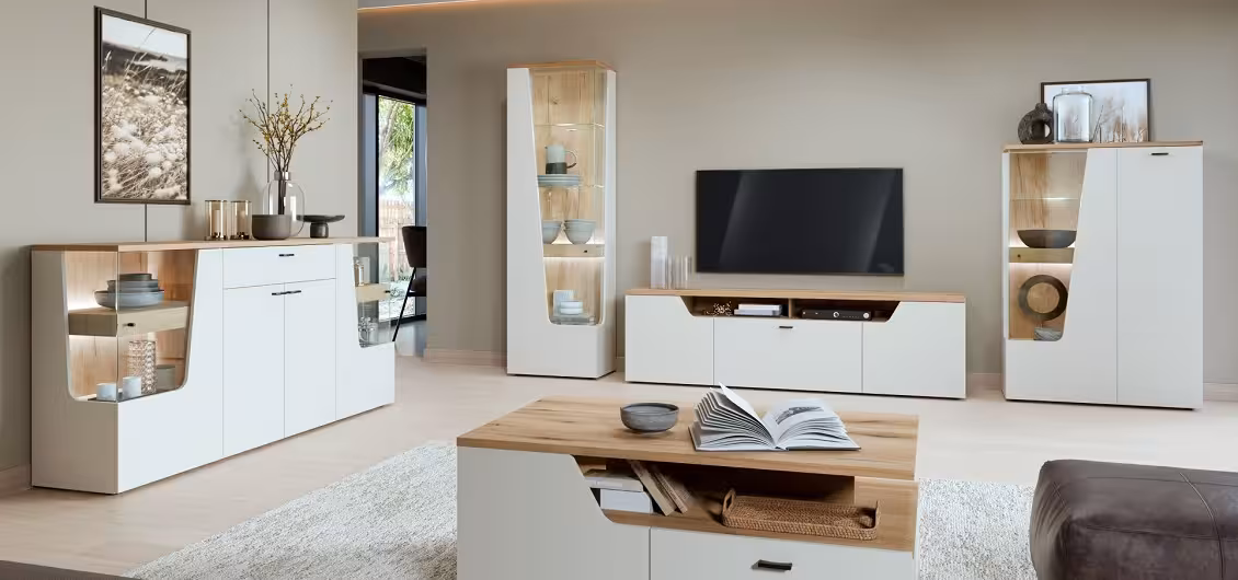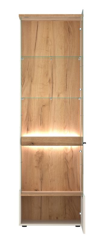 Witryna posiada wbudowane oświetlenie Gama które wprowadza przyjemne, nastrojowe światło. Możesz też dobrać dodatkowe punkty LED z klipsem, jeśli chcesz jeszcze mocniej podkreślić wybrane elementy. Oświetlenie LED z klipsem jest dodatkowo płatne.