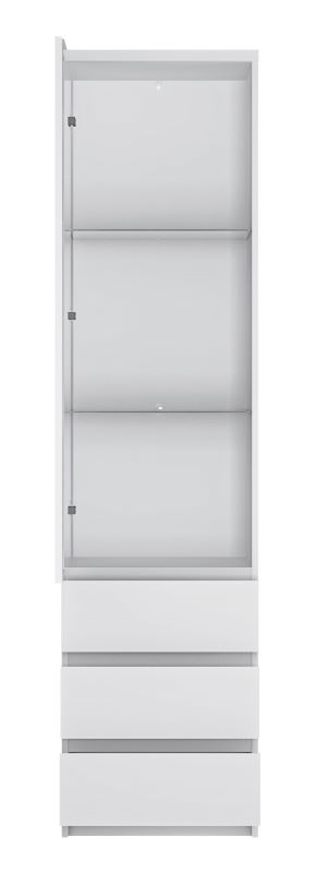 Witryna Fribo FRIV01 to połączenie elegancji i praktyczności w nowoczesnym wydaniu. Mebel wyposażono w trzy pojemne szuflady z pełnym wysuwem, które pomieszczą niezbędne drobiazgi i akcesoria, oraz przeszkloną część ekspozycyjną – idealną do wyeksponowania dekoracji, zastawy lub pamiątek rodzinnych. Dzięki możliwości montażu drzwi na lewą lub prawą stronę, witrynę można łatwo dopasować do układu pomieszczenia, co czyni ją niezwykle uniwersalnym rozwiązaniem do każdego wnętrza.