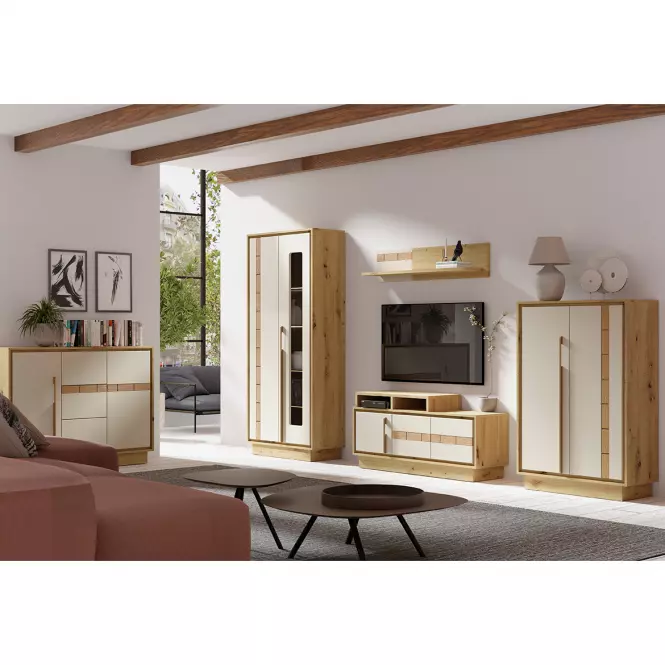 Witryna wykonana jest z wysokiej jakości materiałów, co zapewnia jej solidność i trwałość. Fronty z płyty MDF foliowanej oraz drewna są matowe, co nie tylko podkreśla nowoczesny styl mebla, ale także ułatwia jego utrzymanie w czystości. Wnętrze witryny zostało zaprojektowane z myślą o funkcjonalności; z dwudrzwiowymi frontami, użytkownik zyskuje łatwy dostęp do przechowywanych w niej przedmiotów.