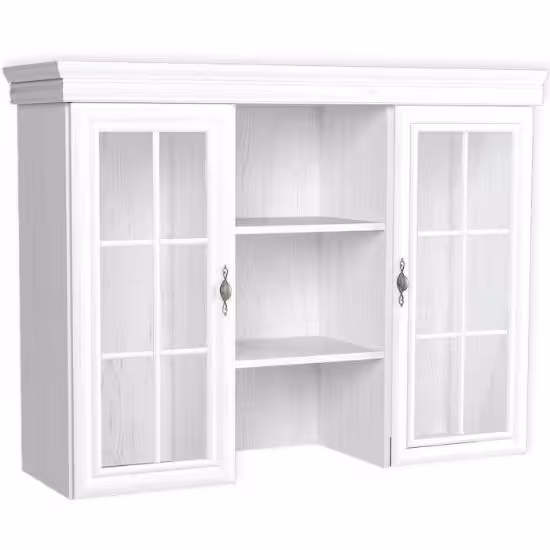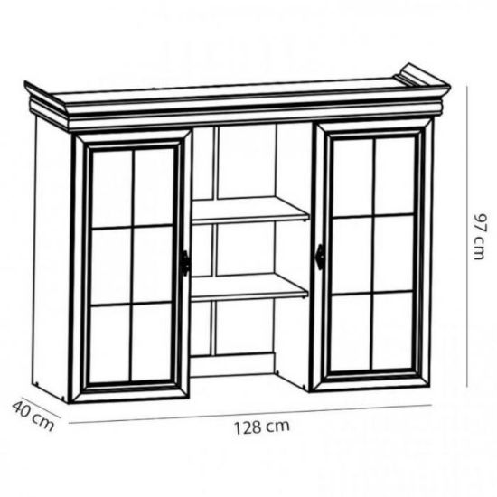 Ozdobne ramiaki w pełnych frontach oraz urocze szprosy we frontach przeszklonych nadają witrynie wyjątkowego charakteru, dodając delikatności i finezji całej kompozycji. Opcjonalne klimatyczne oświetlenie do półek drewnianych to dodatkowa opcja, umożliwiająca podkreślenie przechowywanych treści. Przyciemniane szkło antisol nadaje witrynie eleganckiego wyglądu, podkreślając jednocześnie jej klasyczny styl. Solidny cokół z ozdobnymi, masywnymi nogami dodaje stabilności i szlachetności, sprawiając, że mebel idealnie wpisuje się w tradycję stylu klasycznego.