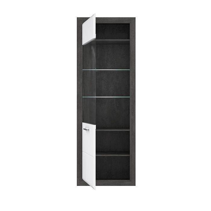 Witryna L Lennox New posiada jedno uchylne drzwi, umożliwiające wygodny dostęp do półek. Przestronna komora pozwala na przechowywanie książek, dekoracji, szkła i porcelany. Matowy korpus w kolorze beton ciemnoszary w połączeniu z frontami w białym połysku nadaje wnętrzu nowoczesnego charakteru, tworząc atrakcyjny kontrast.