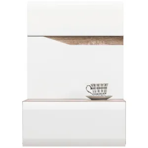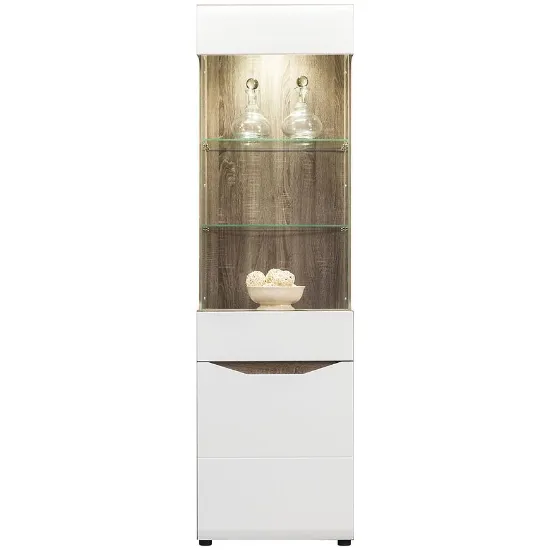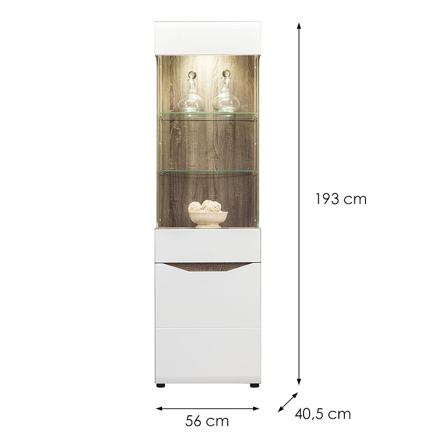 Witryna Lionel Li06 Dąb S./Biały to stylowy i funkcjonalny mebel, idealny do nowoczesnych wnętrz. Połączenie ciepłego odcienia dębu sonoma z białymi frontami nadaje jej elegancji i lekkości. Przeszklona część pozwala efektownie wyeksponować dekoracje, książki lub zastawę, a zamknięte półki zapewniają praktyczną przestrzeń do przechowywania. Doskonała do salonu, jadalni lub gabinetu, łącząc estetykę z wygodą użytkowania.