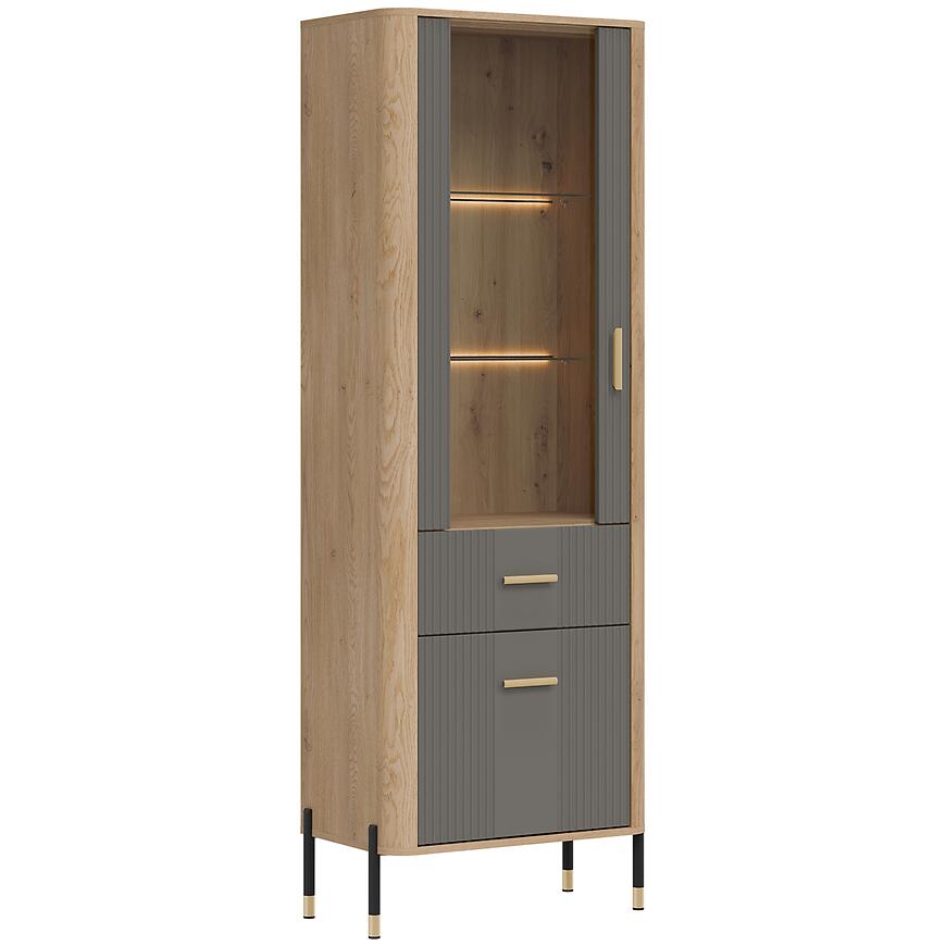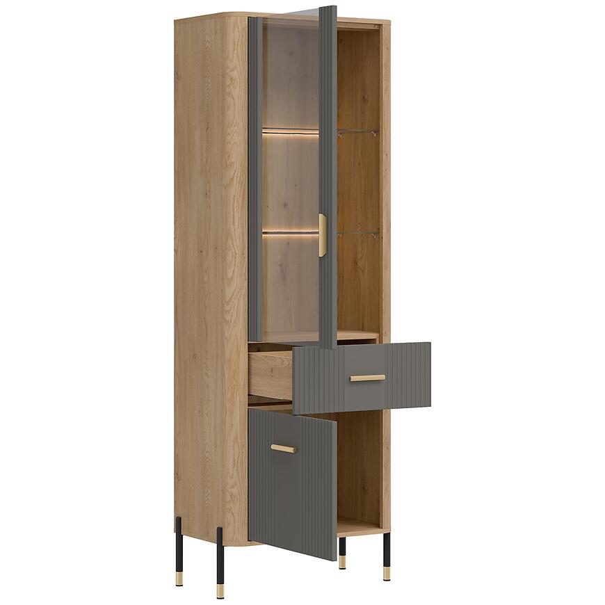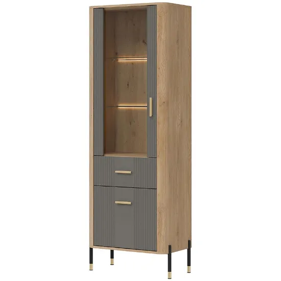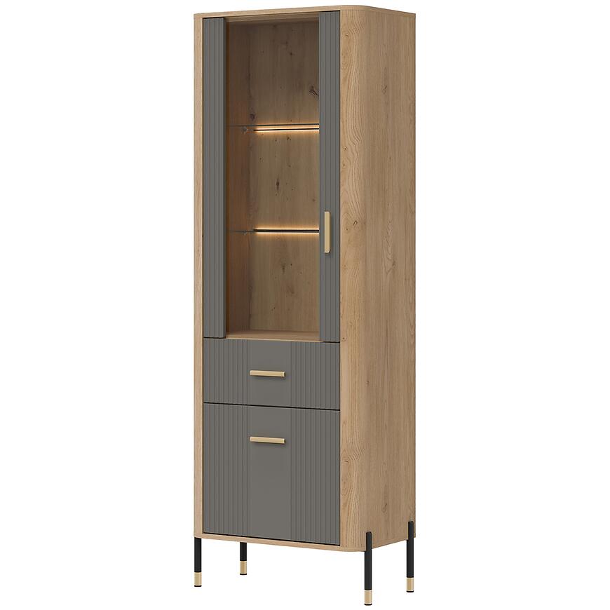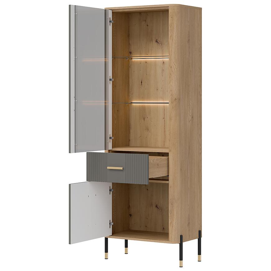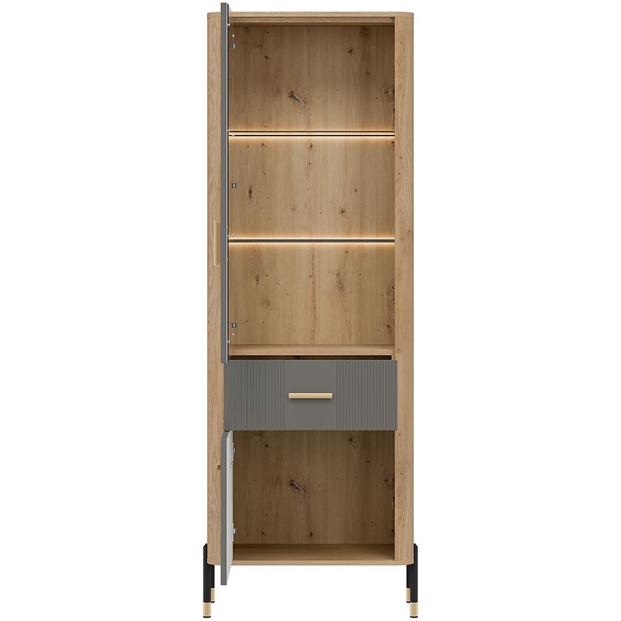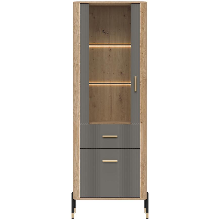 Witryna L/P Dante DT13 dąb cremona szary z LED to nowoczesny i funkcjonalny mebel, który łączy elegancki design z praktycznym układem przechowywania i eksponowania przedmiotów, tworząc stylową i uporządkowaną przestrzeń w salonie lub jadalni.