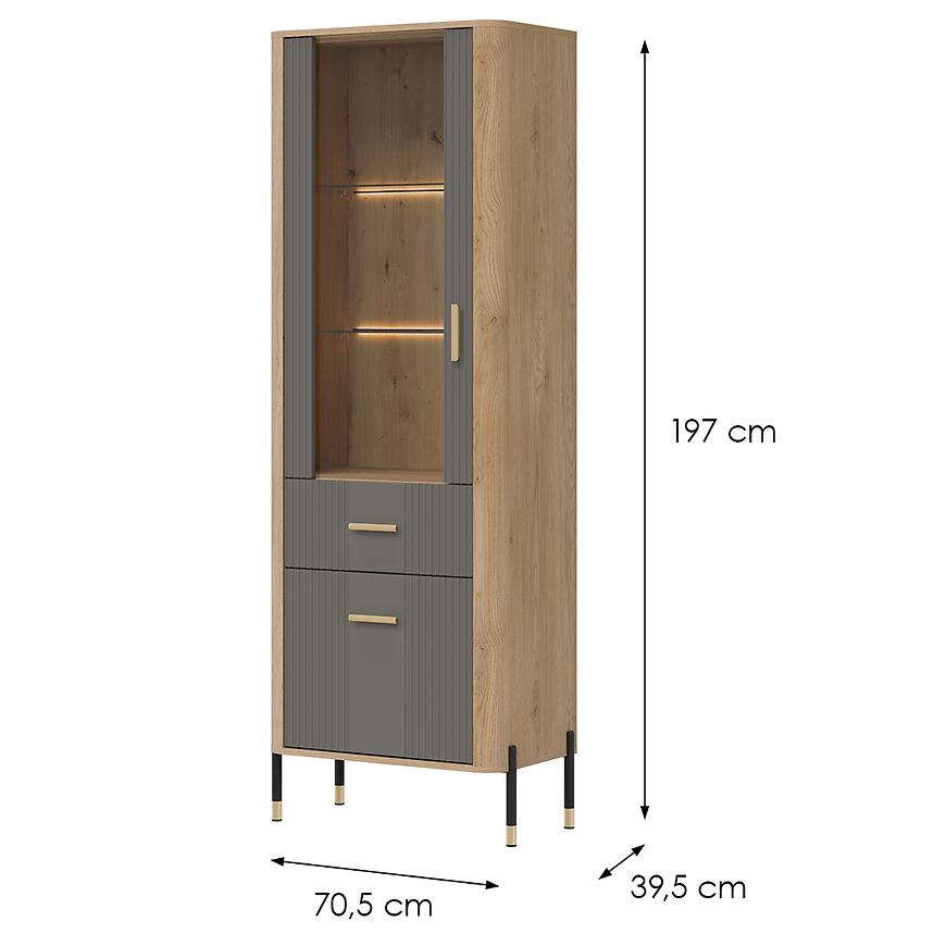 Wysokość 197 cm, szerokość 70,5 cm i głębokość 39,5 cm zapewniają przestronną powierzchnię do przechowywania i prezentowania przedmiotów. Dwudrzwiowa konstrukcja umożliwia wygodny dostęp do wnętrza, a szklane elementy subtelnie eksponują dekoracje, podkreślając nowoczesny charakter pomieszczenia.