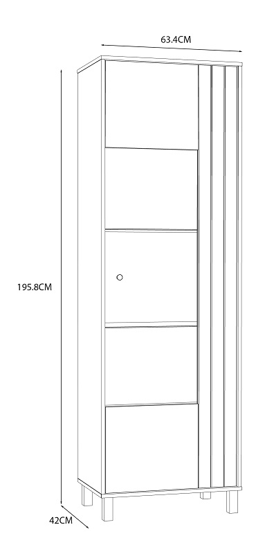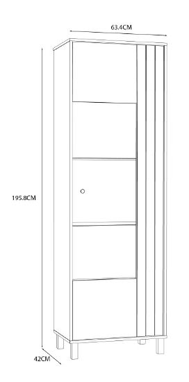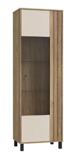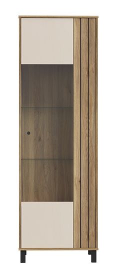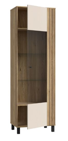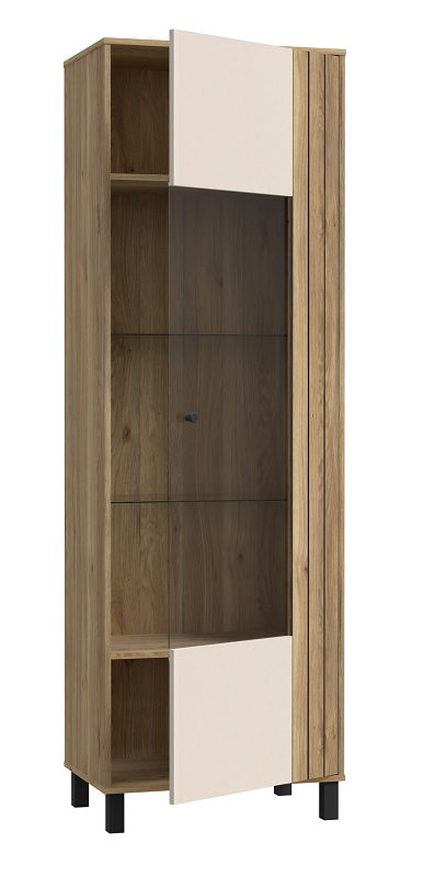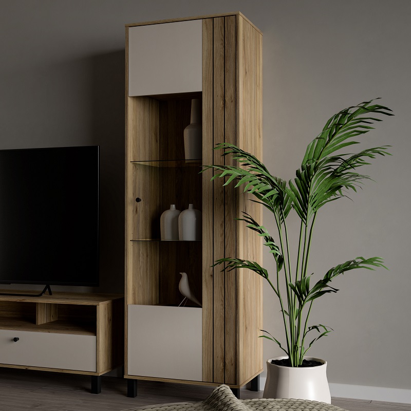 Witryna, jako jednodrzwiowy mebel, zachwyca swoją formą. Drzwi częściowo przeszklone nie tylko dodają lekkości, ale również pozwalają na eksponowanie pięknych przedmiotów, dekoracji czy kolekcji. Cztery półki - dwie wykonane ze szkła i dwie z płyty meblowej - tworzą idealne miejsce do przechowywania i wyeksponowania rzeczy, które chcesz mieć zawsze na widoku.