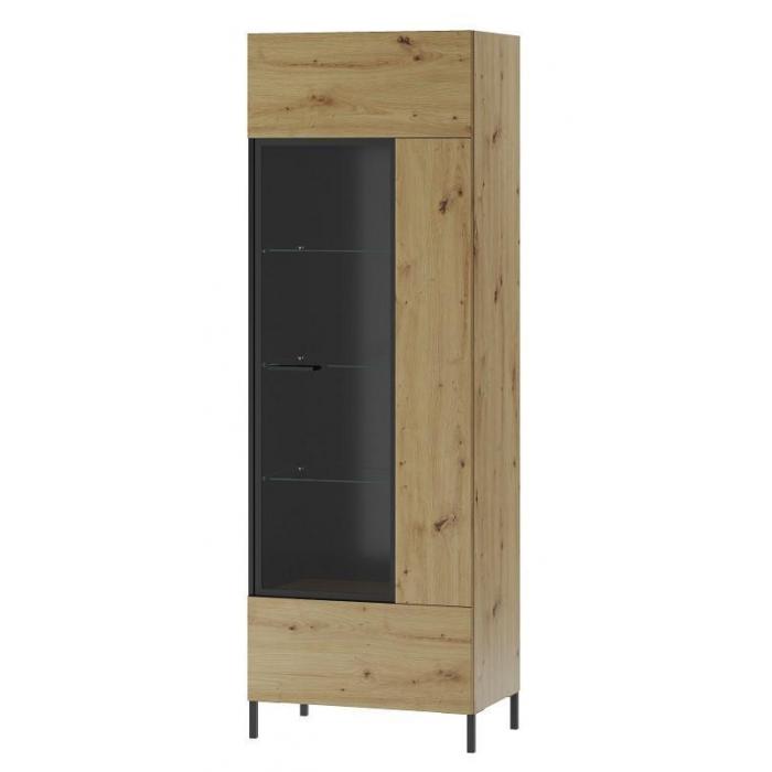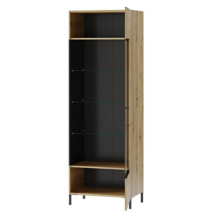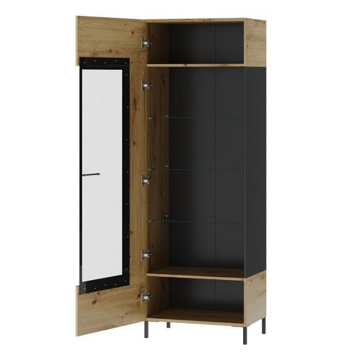 Witryna wysoka wykonana z płyty meblowej foliowanej w kolorze dąb artisan. Na frontach zastosowano wstawki w kolorze czarny mat. Drzwi witryny można montować na prawą lub lewą stronę. W drzwiczkach zastosowano system cichego domyku oraz użyto szkła hartowanego. Szklane fronty osadzone w czarnych metalowych ramach. Uchwyty w kolorze czarnym wykonane z tworzywa. Całość pakowana w jedną paczkę.