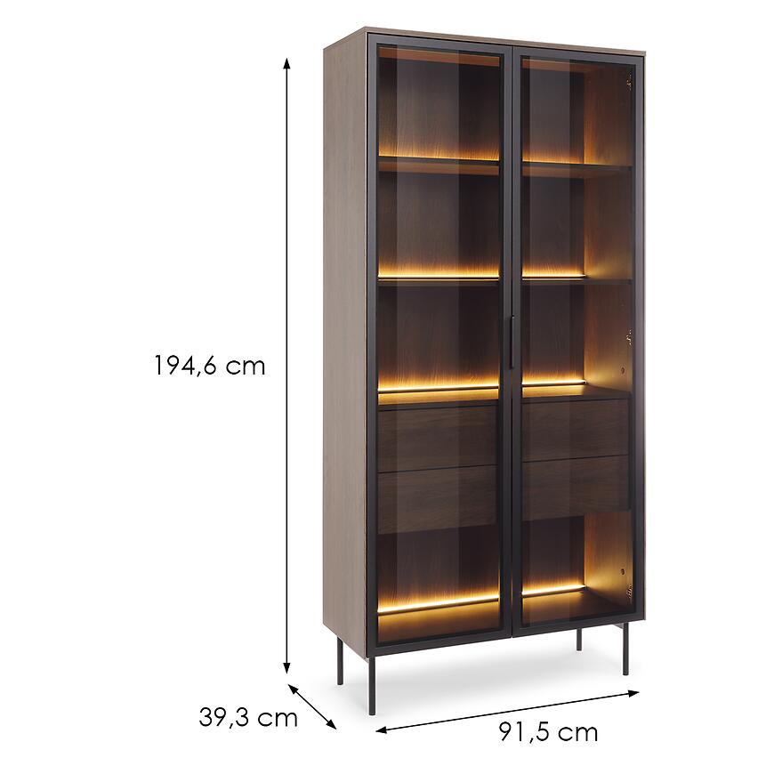 Cztery półki zapewniają dużą powierzchnię do przechowywania i ekspozycji, natomiast dwie szuflady zwiększają funkcjonalność bryły, oferując miejsce na elementy, które warto mieć pod ręką, ale poza bezpośrednim widokiem. Taki układ sprawia, że witryna Lumi Wys A 91 2d2s LED Dąb Dunin Czarny łączy walory wizualne z praktycznym zastosowaniem.