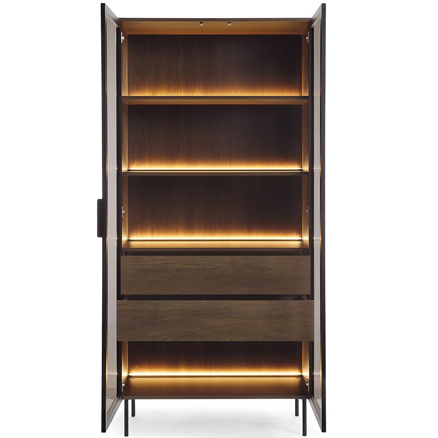 Zastosowane oświetlenie LED, dostępne w standardzie, subtelnie podkreśla zawartość witryny i dodaje jej nowoczesnego charakteru. Światło LED wpływa nie tylko na wygląd mebla, ale także na odbiór całej przestrzeni, tworząc przyjemny efekt wizualny bez nadmiernej intensywności.