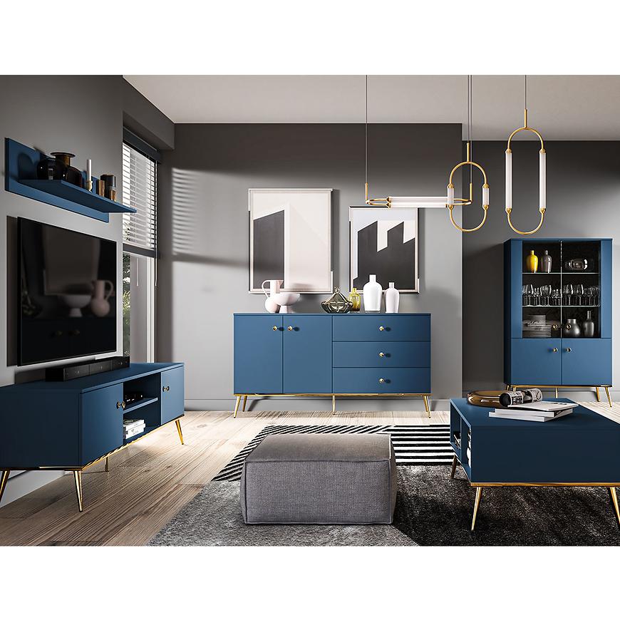 Kolorystyka i wykończenie: Witryna Marine wyróżnia się jednolitym, głębokim odcieniem ciemnego błękitu, który nadaje meblowi elegancji i subtelnego charakteru. Matowe wykończenie frontów i korpusu sprawia, że witryna prezentuje się niezwykle nowocześnie i estetycznie, a jednocześnie jest łatwa do utrzymania w czystości.
