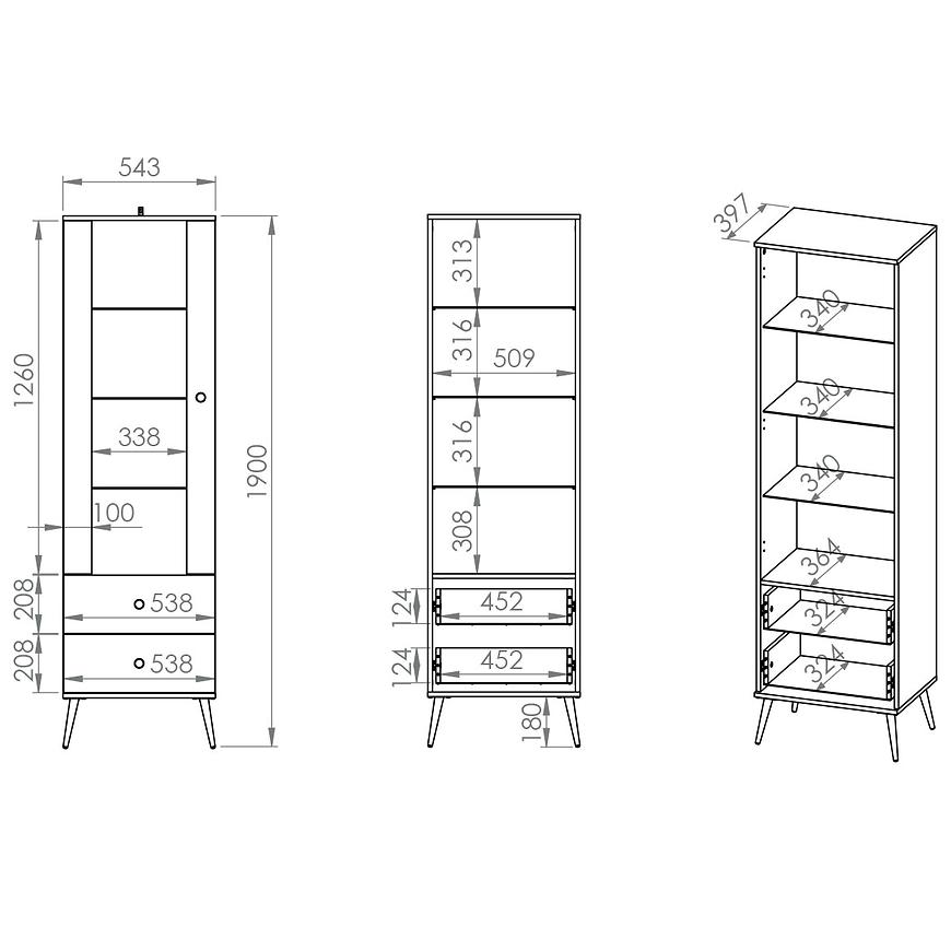 Materiały: Konstrukcja witryny wykonana jest z wysokiej jakości płyty wiórowej laminowanej, co zapewnia jej trwałość i odporność na uszkodzenia. Solidne wykonanie gwarantuje stabilność mebla, a także długotrwałe użytkowanie bez utraty estetycznego wyglądu.