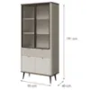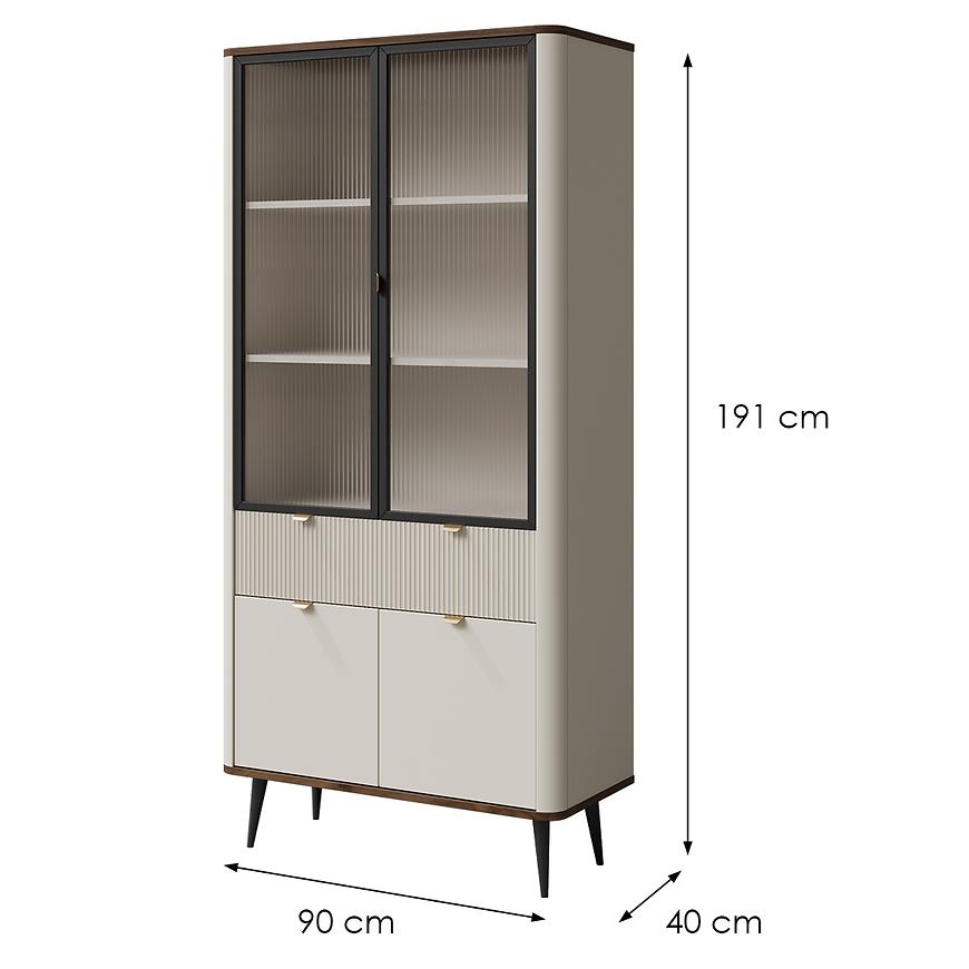 Witryna została wykonana z trwałej płyty wiórowej laminowanej, co zapewnia jej odporność na codzienne użytkowanie. Korpus łączący płytę i metal dodaje konstrukcji stabilności oraz nowoczesnego charakteru. Mebel wyposażono w 3 praktyczne półki, 1 pojemną szufladę oraz kilkudrzwiowe zamknięcie, co czyni go doskonałym miejscem do przechowywania książek, dekoracji czy zastawy stołowej.