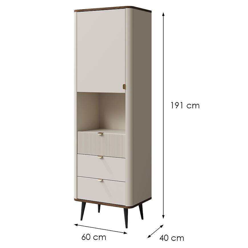Witryna została wykonana z trwałej płyty wiórowej laminowanej, co zapewnia jej odporność na codzienne użytkowanie. Korpus łączący płytę i metal dodaje konstrukcji stabilności oraz nowoczesnego charakteru. Mebel wyposażono w 2 praktyczne półki, 3 pojemne szuflady oraz jednodrzwiowe zamknięcie, co czyni go doskonałym miejscem do przechowywania książek, dekoracji czy zastawy stołowej.