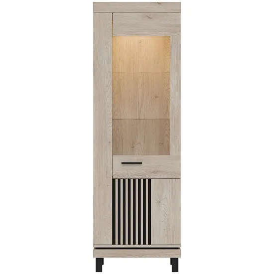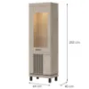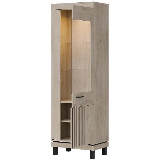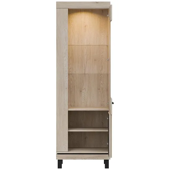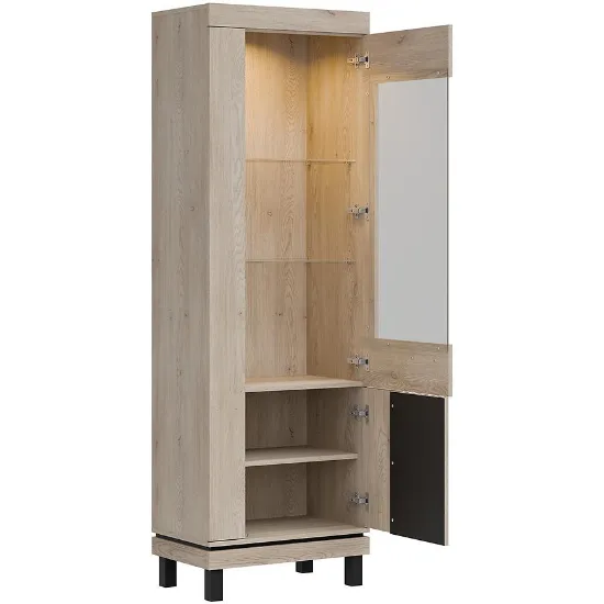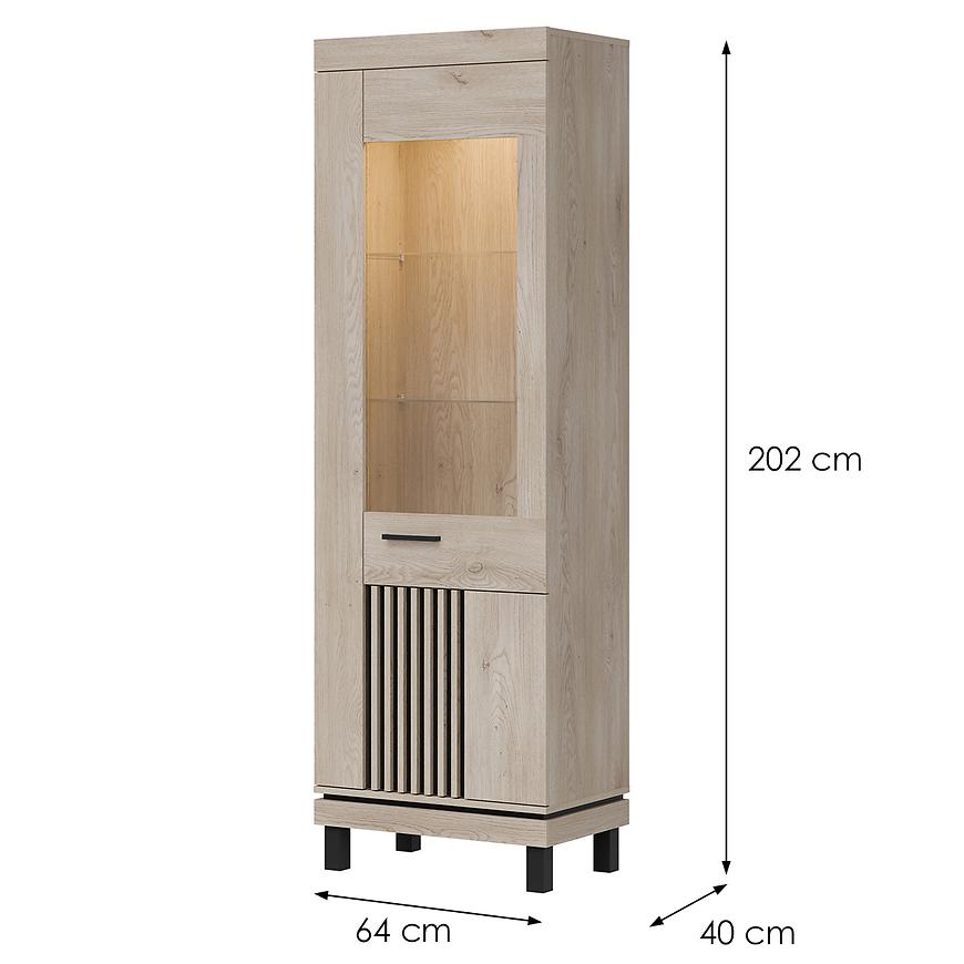 Wewnątrz witryny znajdują się trzy pojemne półki, które doskonale sprawdzą się do eksponowania dekoracji, zastawy stołowej czy książek. Dodatkowym atutem jest możliwość wyposażenia mebla w nowoczesne oświetlenie LED (dostępne za dopłatą), które podkreśli wyeksponowane elementy i nada wnętrzu wyjątkowego klimatu.
