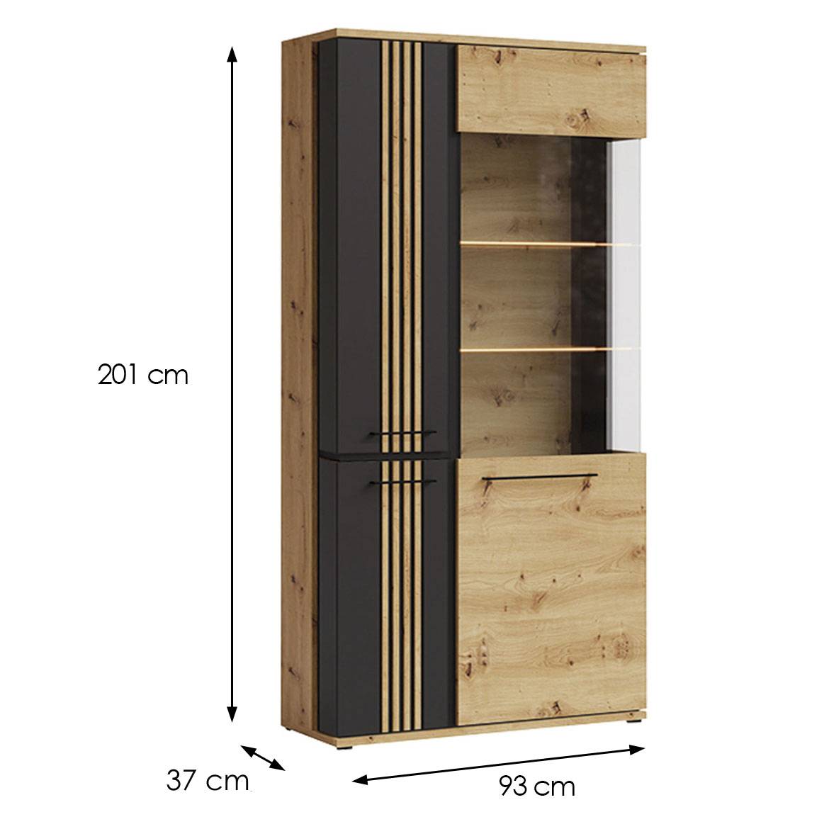 Witryna posiada jedne drzwi z przeszkleniem, co pozwala na subtelne prezentowanie przechowywanych przedmiotów. Przeszklone drzwi dodają również lekkości i elegancji całej konstrukcji. Wewnątrz znajduje się siedem półek, które umożliwiają rozmieszczenie różnorodnych elementów i asortymentu. Połączenie kolorów czerni i dębu artisan dodaje elegancji i stylu do Twojego wnętrza. Witryna jest świetnym elementem dekoracyjnym, który przyciąga wzrok i dodaje charakteru pomieszczeniu. Witryna jest wyposażona w oświetlenie, które jest standardowym jej elementem. To oznacza, że Twoje przechowywane przedmioty będą odpowiednio podświetlone i z łatwością będą widoczne dla każdego.