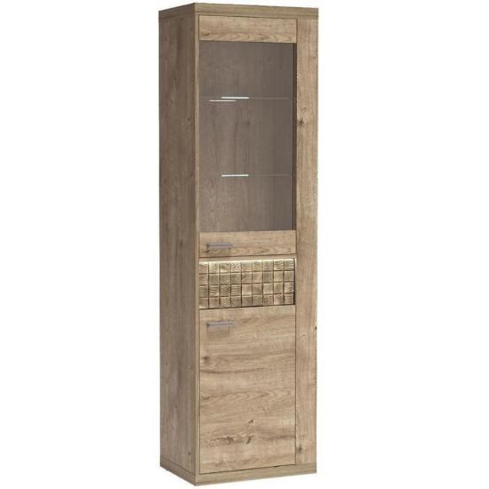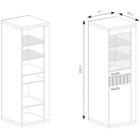 Witryna składa się z dwóch drzwi. w górnych ze szkła hartowanego znajdują się dwie szklane półki np. na książki, zdjęcia lub pamiątki. Dolna szafka posiada jedną półkę. Na uwage zasługuje szuflada, znajdująca się pomiędzy drzwiami z wygodnym w otwieraniu systemem "PUSH to OPEN". Całości charakteru i funkcjonalności nadają metalowe uchwyty i cichy domyk.