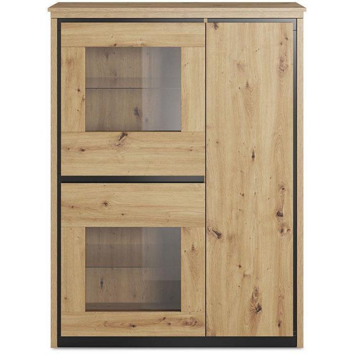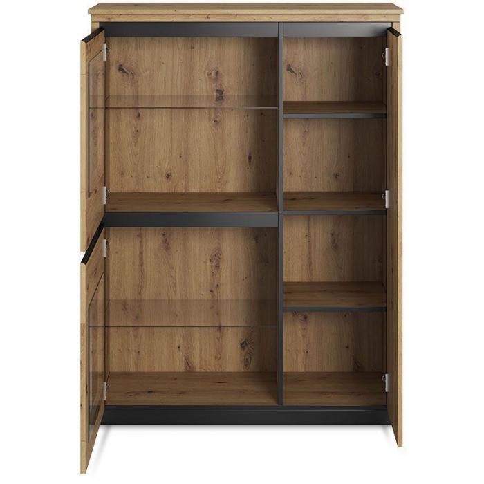 Witryna niska Baldo BL-04 to mebel należący do kolekcji Baldo. Kolory, jakie wybrano przy tym projekcie tworzą spójną harmonię, która doskonale wkomponuje się w nowoczesne przestrzenie. Dąb artisan i czerń to odcienie nadające witrynie niepowtarzanego charakteru. Przewaga dębowego koloru sprawia, że mebel będzie pasować również do salonów i pomieszczeń zaaranżowanych w stylu tradycyjnym. Witryna niska Baldo BL-04 to niski, dwudrzwiowy mebel, który pomimo swoich niewielkich rozmiarów pomieści wszystkie najważniejsze drobiazgi i domowe przedmioty. Za jego pomocą schowamy dyskretnie ważne dokumenty, a także wyeksponujemy rodzinne pamiątki czy fotografie w miejscu przeszklonych półek. Materiały zastosowane podczas produkcji mebla wyróżniają się wysoką jakością, która gwarantuje zadowolenie z zakupu i użytkowanie przez długi czas.