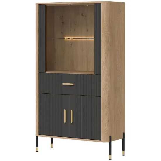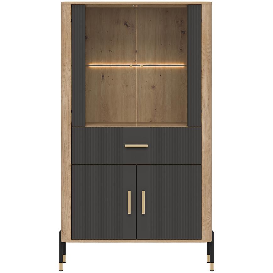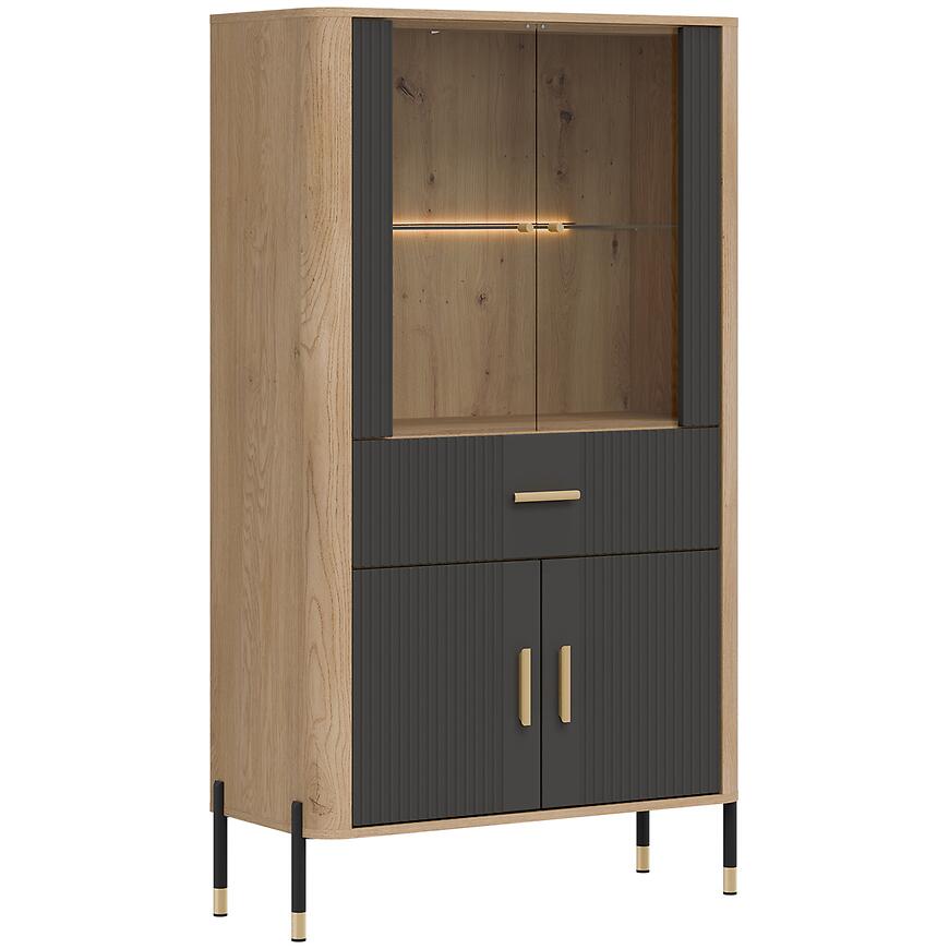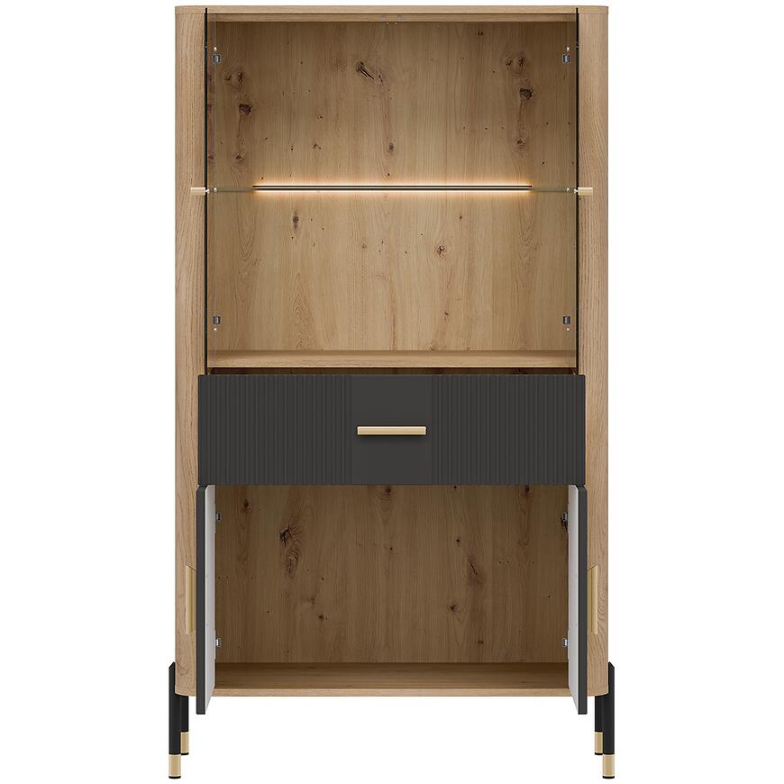 Antracytowe fronty w matowym wykończeniu harmonizują z korpusem w kolorze dąb cremona, nadając meblowi nowoczesny i elegancki charakter. Niska witryna Dante DT12 doskonale komponuje się z innymi meblami z kolekcji DANTE oraz dodatkami w neutralnych i naturalnych tonacjach.