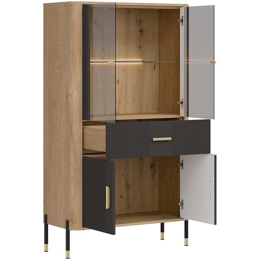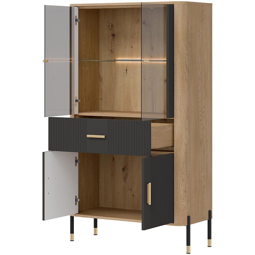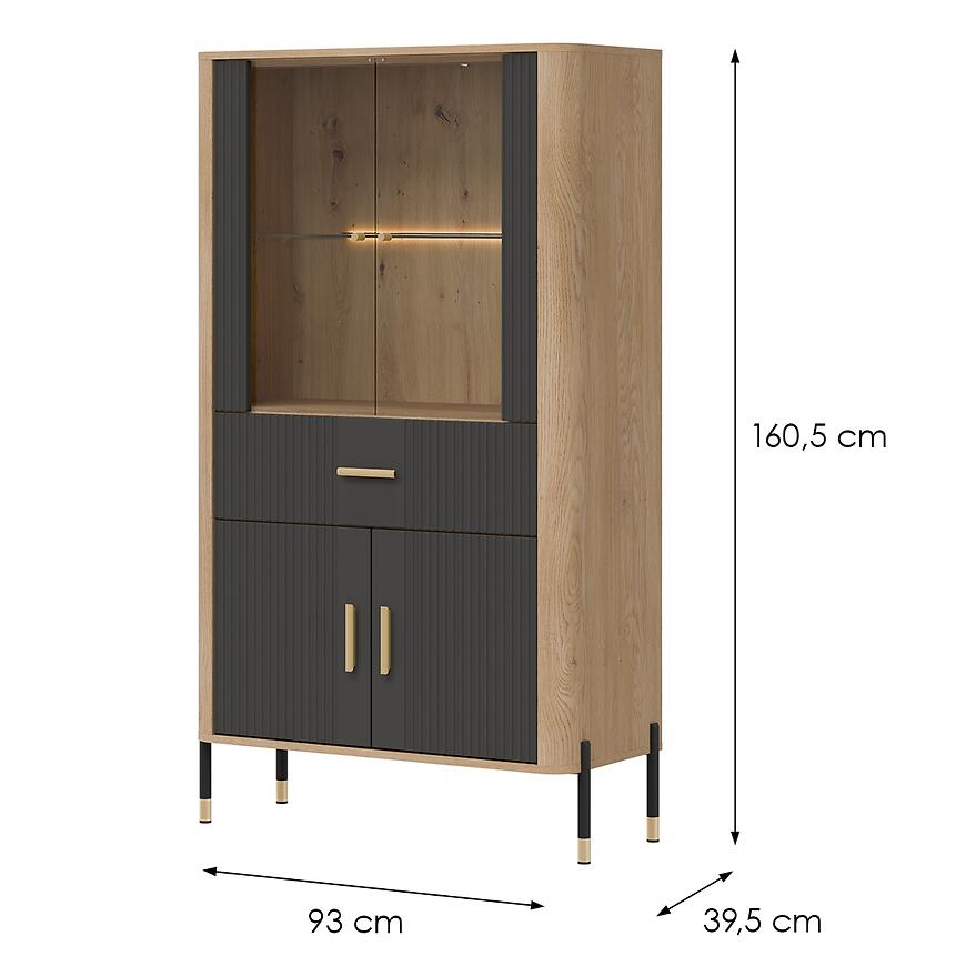 Wysokość 160,5 cm, szerokość 93 cm i głębokość 39,5 cm zapewniają przestronną powierzchnię do przechowywania i wyeksponowania przedmiotów. Kilkudrzwiowa konstrukcja ułatwia dostęp do wnętrza, a szklane elementy subtelnie prezentują dekoracje, nadając pomieszczeniu nowoczesny i stylowy charakter.