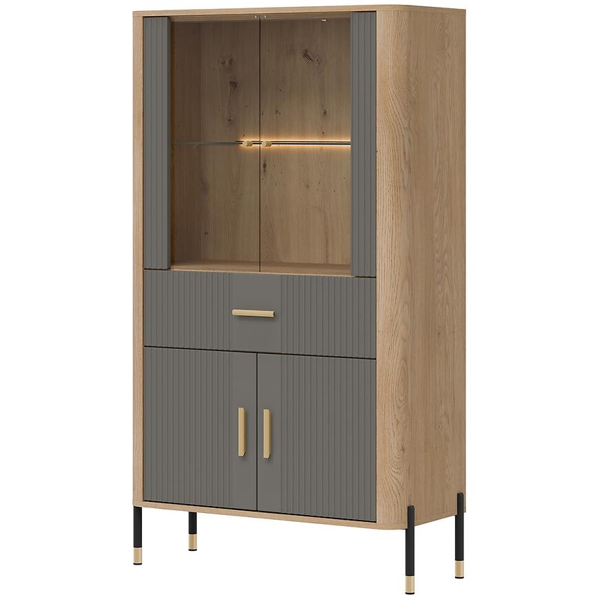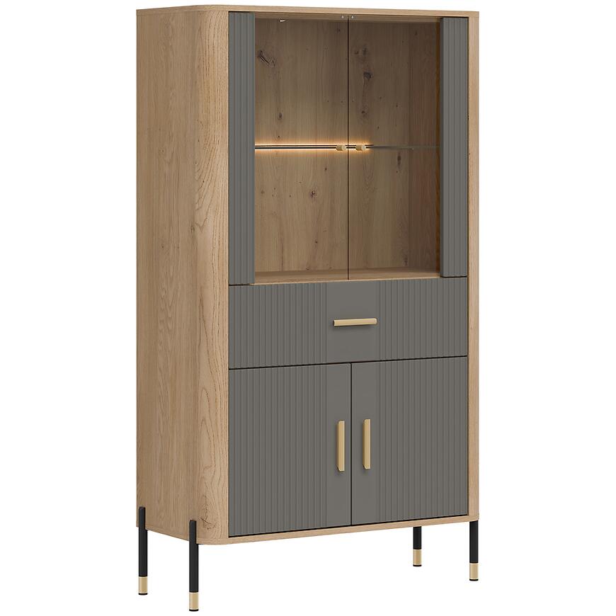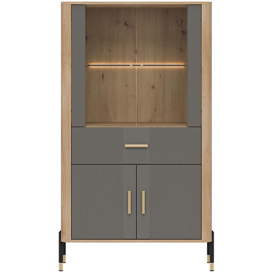 Szare fronty w matowym wykończeniu harmonizują z korpusem w kolorze dąb cremona, nadając witrynie nowoczesny i elegancki charakter. Niska witryna Dante DT12 doskonale komponuje się z innymi meblami z kolekcji DANTE oraz dodatkami w neutralnych i naturalnych tonacjach.