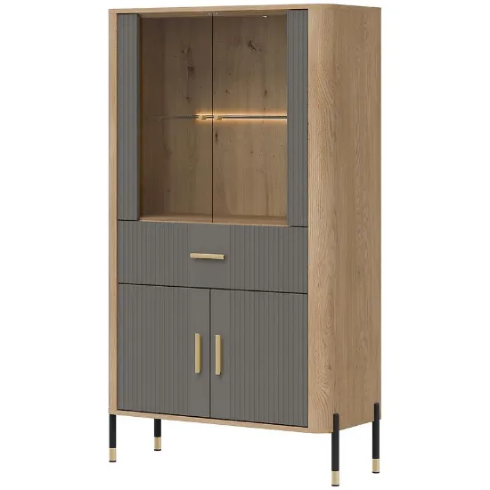 Niska witryna Dante DT12 w kolorze dąb cremona z szarymi frontami to elegancki mebel łączący nowoczesny design z praktycznym układem przechowywania. Stonowany szary kolor frontów w połączeniu z naturalnym odcieniem drewna wprowadza do wnętrza harmonię i uporządkowany charakter, a matowe wykończenie frontów i korpusu podkreśla minimalistyczną, stylową formę witryny. Opcjonalne oświetlenie LED pozwala efektownie wyeksponować dekoracje, zastawę lub pamiątki, nadając wnętrzu przytulny i elegancki klimat.