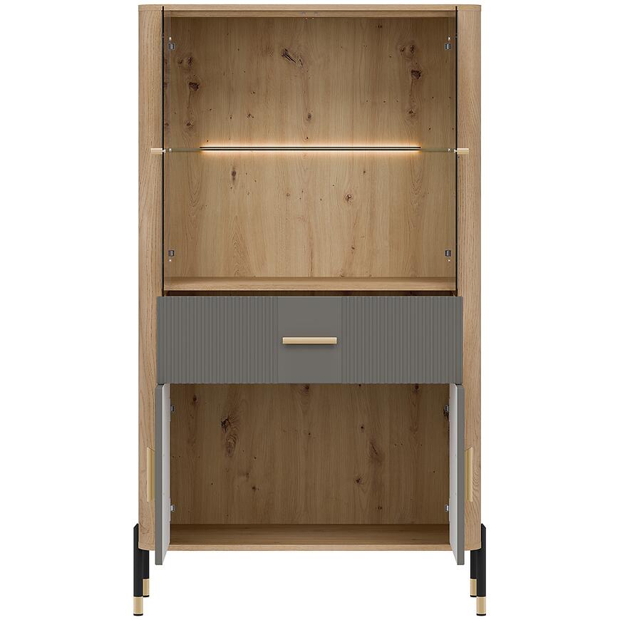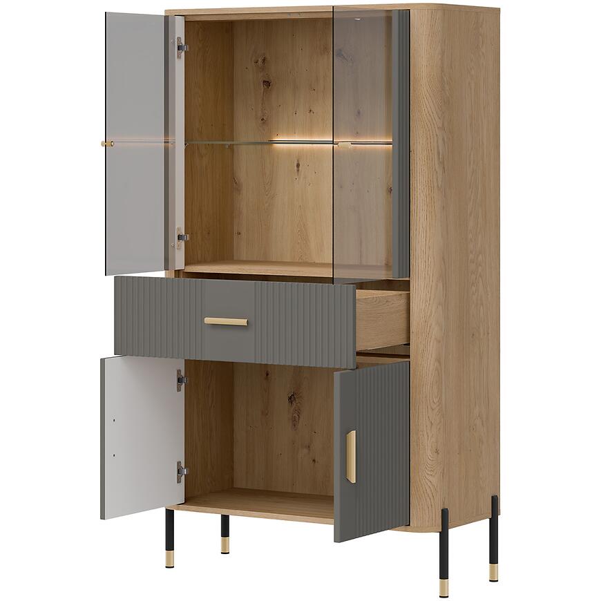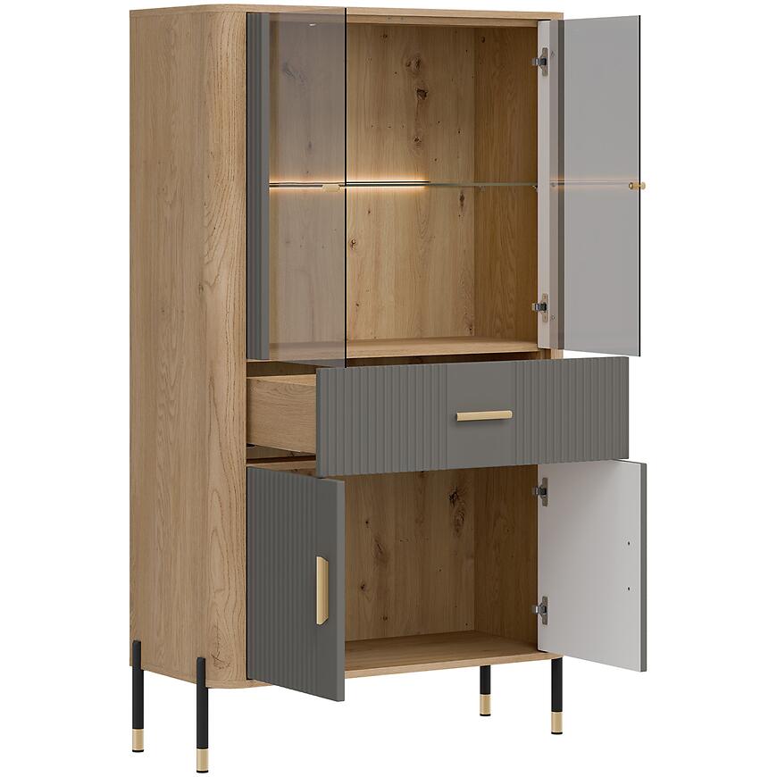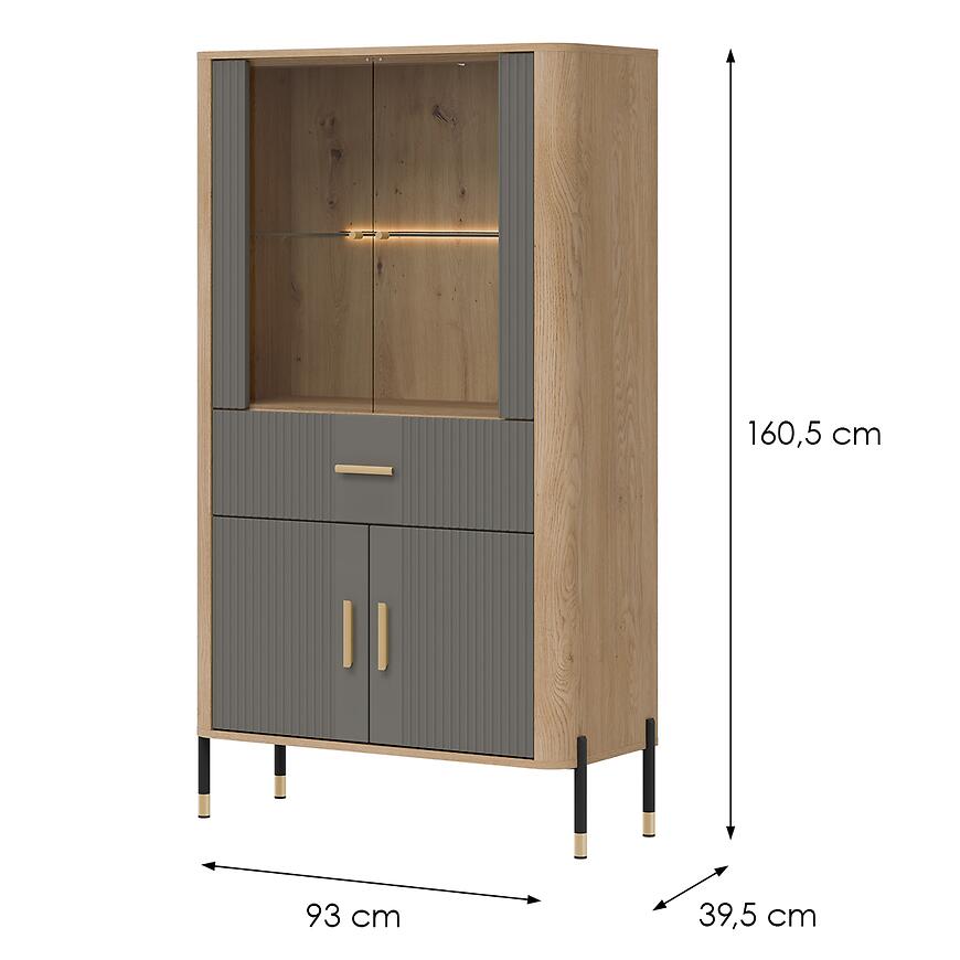 Wysokość 160,5 cm, szerokość 93 cm i głębokość 39,5 cm zapewniają przestronną powierzchnię do przechowywania i prezentacji przedmiotów. Kilkudrzwiowa konstrukcja ułatwia wygodny dostęp do wnętrza, a szklane elementy subtelnie eksponują dekoracje, podkreślając nowoczesny charakter pomieszczenia.