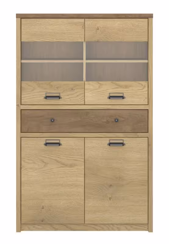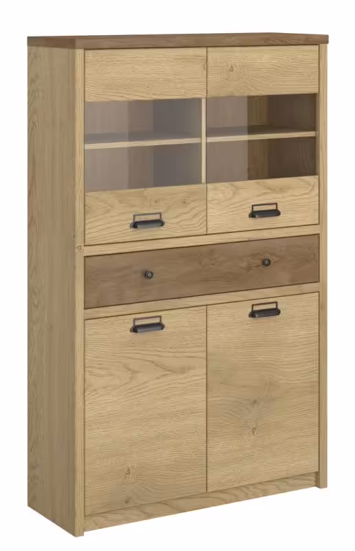 Model 4D1S wyposażony jest w dwa fronty przeszklone oraz dwa fronty pełne w dekorze dąb lefkas. Taki układ pozwala świadomie podzielić przestrzeń – część rzeczy pozostaje widoczna, a część schowana.