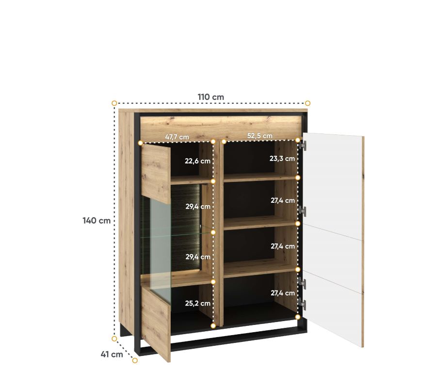 Witryna posiada dwa rodzaje oświetlenia ledowego – zewnętrzne podkreślające przestrzenny charakter frontów (dostępne w komplecie) oraz wewnętrze, umieszczone w części przeszklonej (dostępne w opcji dodatkowej). Smukłe, czarne podpory oraz ciekawy dekor podkreślają nowoczesny styl mebla.