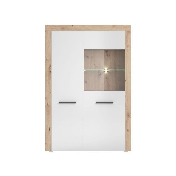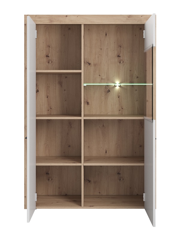 System Elso wykonany z płyty laminowanej w wybarwieniu dąb artisan z frontami w kolorze białym w połysku. Uchwyty wykonane z tworzywa w kolorze czarnym. W skład systemu wchodzą następujące bryły, komoda 2 drzwiowa 4 szuflady, szafka RTV, witryna wysoka, witryna niska, szafa dwudrzwiowa, półka, komoda 4 szuflady, szafa trzydrzwiowa z dwoma szufladami.