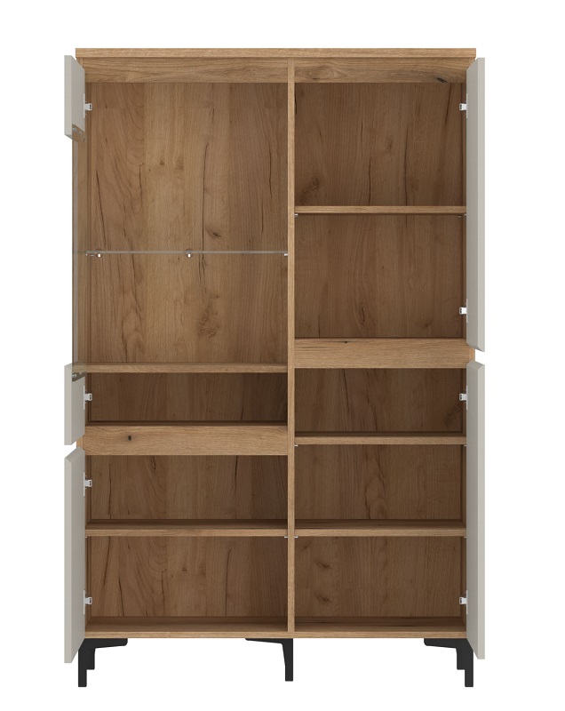 Witryna EXXV05L to doskonałe rozwiązanie dla tych, którzy pragną wyeksponować swoje skarby. Czterodrzwiowa konstrukcja skrywa w swoim wnętrzu cztery półki wykonane z trwałej płyty meblowej oraz jedną szklaną. To idealne miejsce do przechowywania i prezentacji kolekcji książek, biżuterii, czy szklanych naczyń. Przeszklone drzwi po lewej stronie.