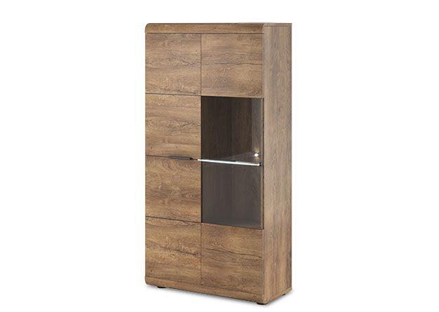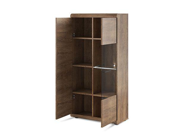 Elegancka witryna niska Lena przyciąga uwagę barwą oraz solidną konstrukcją. Jest nie tylko stylowym dodatkiem aranżacyjnym wnętrza salonu lub pokoju dziennego, ale także wysoce użytkowym meblem. Dzięki płycie meblowej Dąb Lefkas Ciemny witryna zyskała ciekawy, ciemnobrązowy kolor, który spodoba się osobom doceniającym na co dzień drewniane elementy w projektach wnętrz. Funkcjonalny mebel został wyposażony w osiem przestronny szafek w kwadratowym kształcie, w których można przechowywać potrzebne rzeczy. Przedmioty pełniące funkcję dekoracyjną będą dobrze wyeksponowane na przeszklonych dwóch środkowych półkach, a także dzięki dodatkowej możliwości zamontowania oświetlenia LED. W zależności od preferencji właściciela montaż może być lewostronny lub prawostronny. Witryna niska Lena będzie prezentować się wyjątkowo korzystnie w pomieszczeniach, w których dominują jasne barwy.