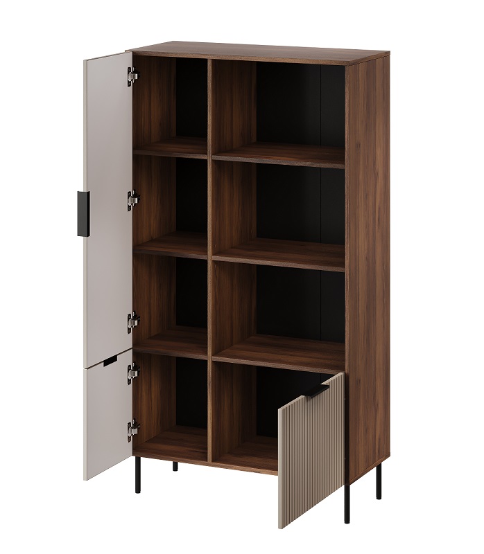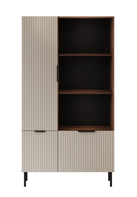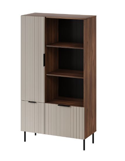 Korpus witryny został wykonany w eleganckim wybarwieniu orzech warmia, co dodaje meblowi klasycznego, ciepłego charakteru. Fronty natomiast, frezowane w delikatnym odcieniu kaszmir lamelka, dodają witrynie nowoczesności i lekkości. Dzięki tym harmonijnym połączeniom kolorystycznym, mebel doskonale wpasuje się zarówno w tradycyjne, jak i nowoczesne wnętrza, nadając im wyjątkowego charakteru.