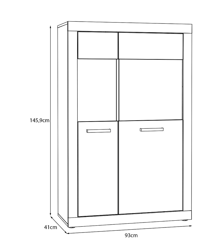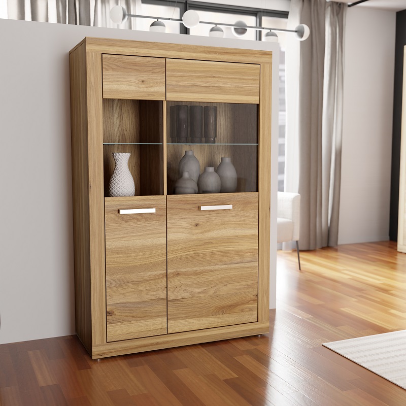 Model Sand został wyposażony w dwie uchylne drzwi, za którymi znajdują się cztery półki. Taka konfiguracja umożliwia wygodne przechowywanie zastawy stołowej, dekoracji, książek i innych akcesoriów domowych. Dwudrzwiowa konstrukcja sprawia, że witryna prezentuje się schludnie, a matowe wykończenie dodaje wnętrzu elegancji i nowoczesnego charakteru.
