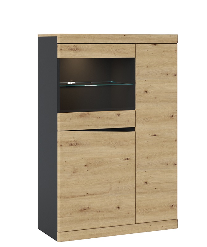 Witryna niska Turino TURV02 to elegancki i funkcjonalny mebel, który wspaniale uzupełni każde wnętrze. Wykonana z wysokiej jakości płyty laminowanej, witryna zapewnia trwałość i estetykę na lata. Jej wyjątkowy design łączy naturalny wygląd dębu artisan z nowoczesnym akcentem antracytowego wybarwienia, tworząc harmonijną kompozycję kolorystyczną.