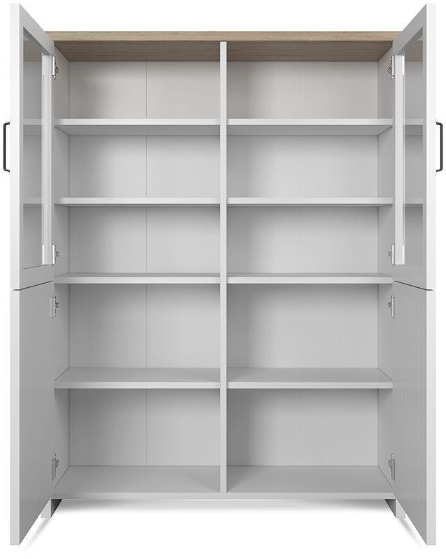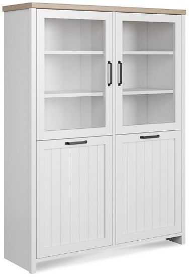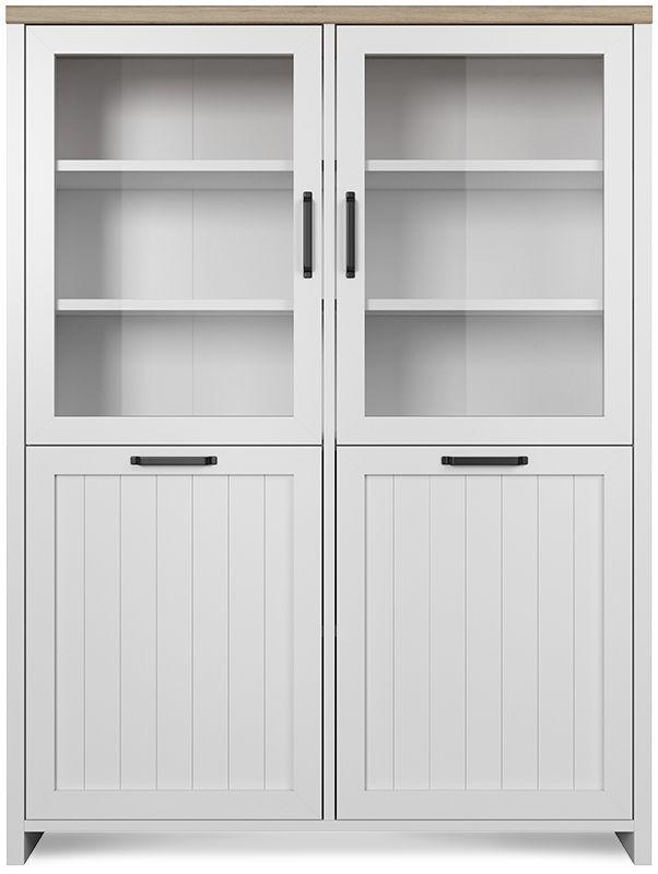 Witryna niska Verne 4 pozwoli przechować niezbędne domowe akcesoria, a jednocześnie wyeksponować dekoracyjne bibeloty. Jest to możliwe dzięki dolnej zamykanej szafce (z czterema półkami) oraz górnej przeszklonej szafce z sześcioma półkami. Jest to idealna witryna do pokoju dziennego, jadalni, a nawet sypialni. Witryna niska Verne 4 została wykonana z płyty laminowanej o grubości 16 mm, co gwarantuje jej wytrzymałość i odporność na uszkodzenia. Uwagę zwraca również niebanalny design mebla. Witryna ma w sobie sporo cech rodem ze stylu kolonialnego: to panelowy front dolnej szafki, połączenie kolorystyczne (biały korpus oraz blat w odcieniu dębu kamiennego), a także czarne metalowe uchwyty. To mebel, obok którego nie można przejść obojętnie.