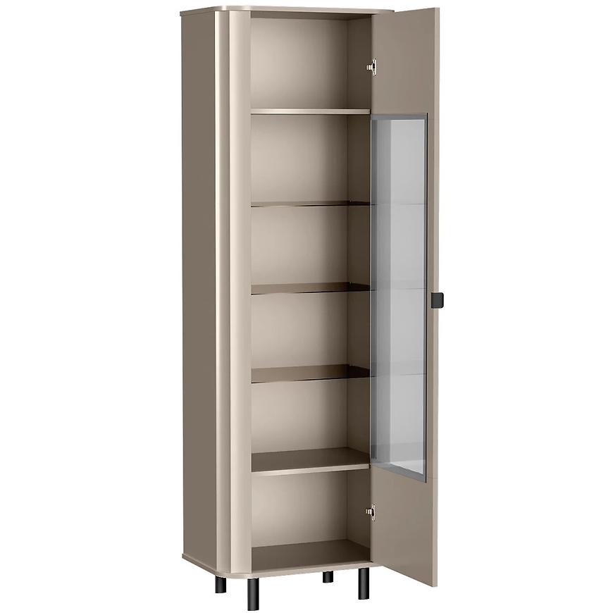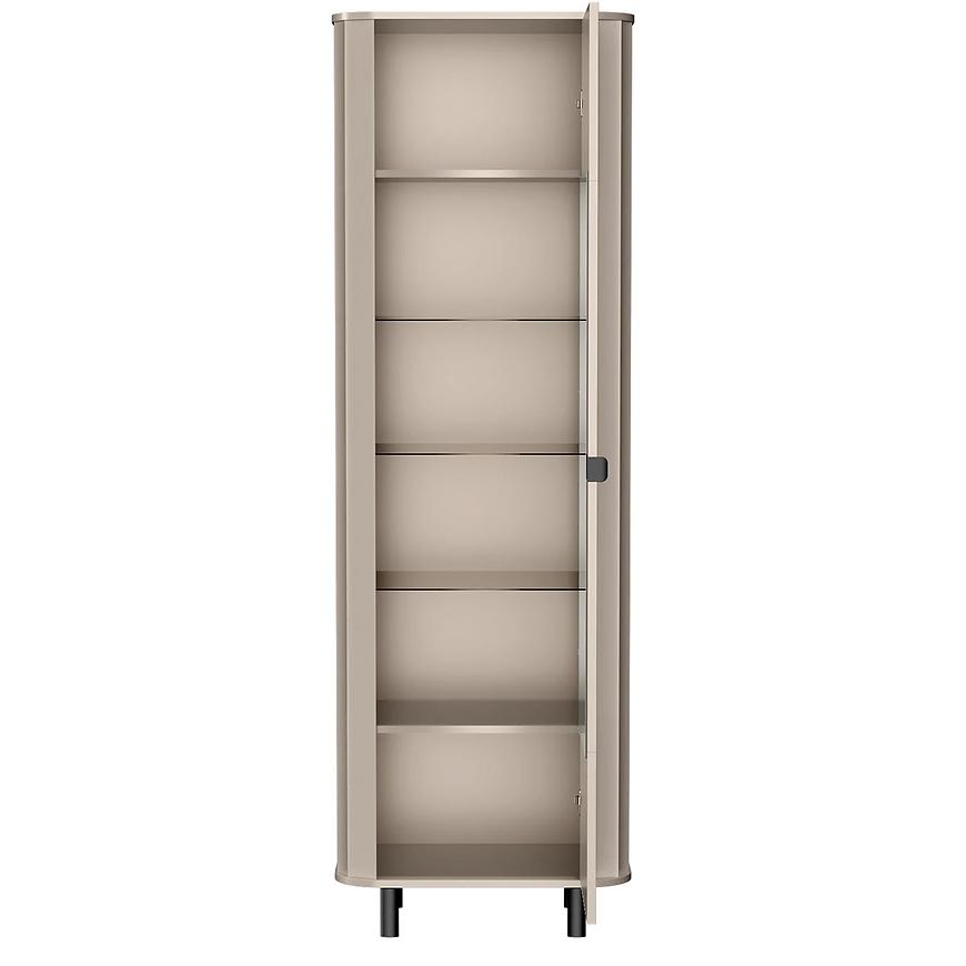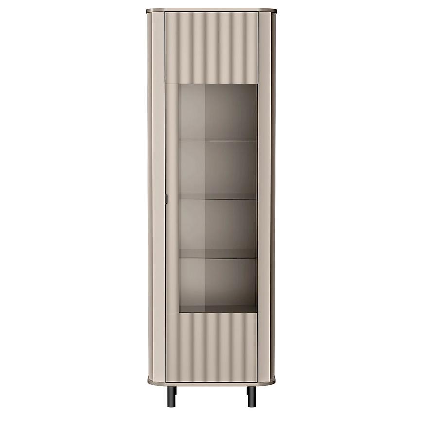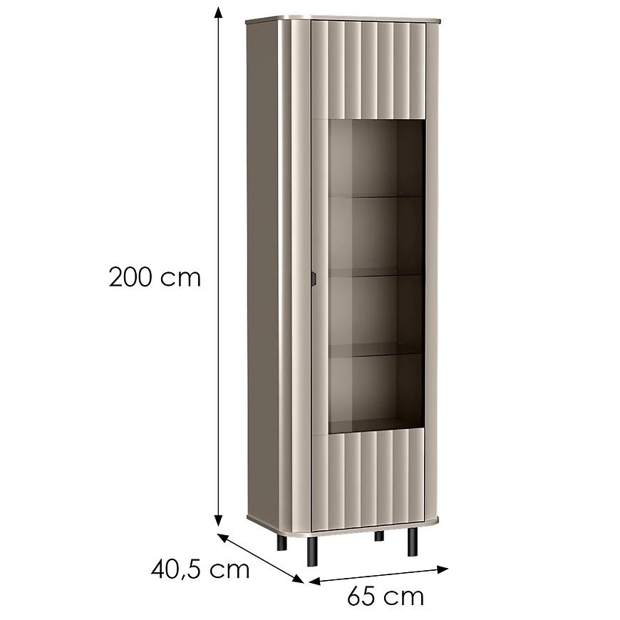 Witryna Novado 4nv Clay Gray to nowoczesny mebel o minimalistycznym designie, idealny do salonu, jadalni. Wykonana z trwałej płyty MDF i laminowanej płyty wiórowej, w eleganckim, matowym wykończeniu w kolorze clay gray. Posiada pięć półek oraz jedno skrzydło drzwiowe, zapewniając dużo miejsca na przechowywanie i ekspozycję. Oświetlenie LED dostępne za dopłatą podkreśla stylową formę. Wymiary: 200 × 65 × 40,5 cm. Witryna wymaga samodzielnego montażu.