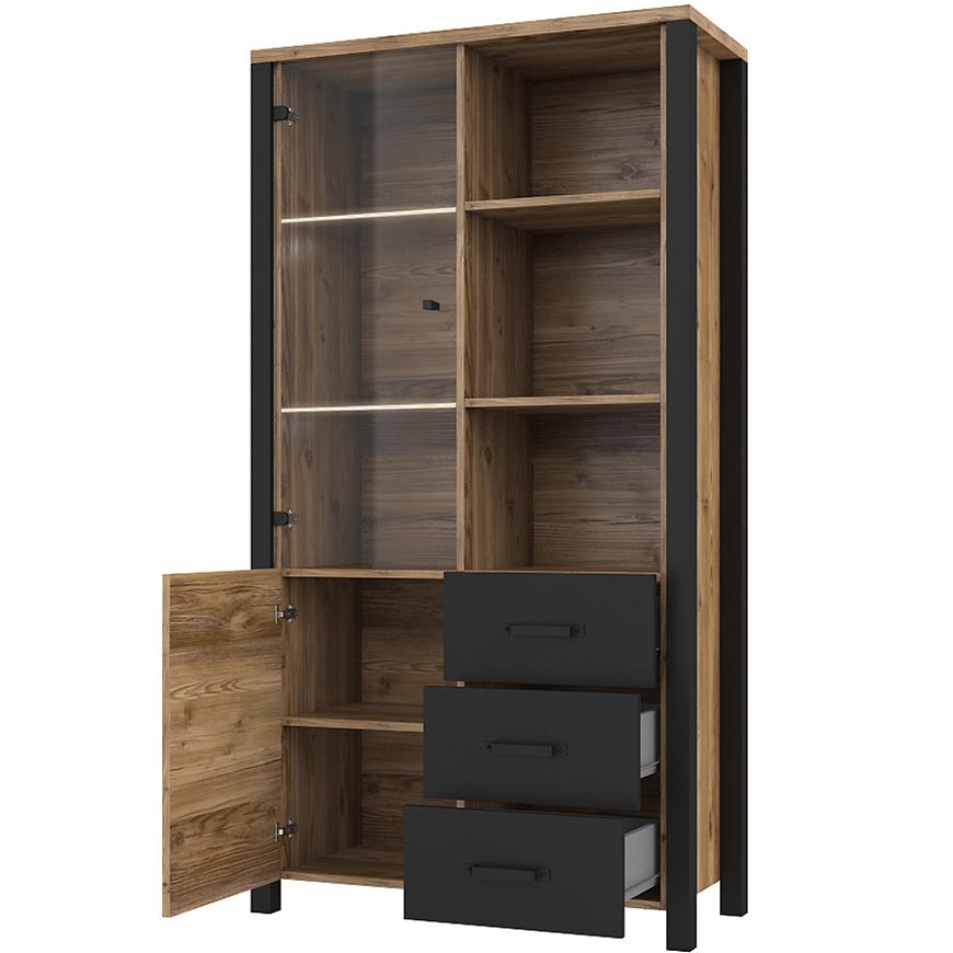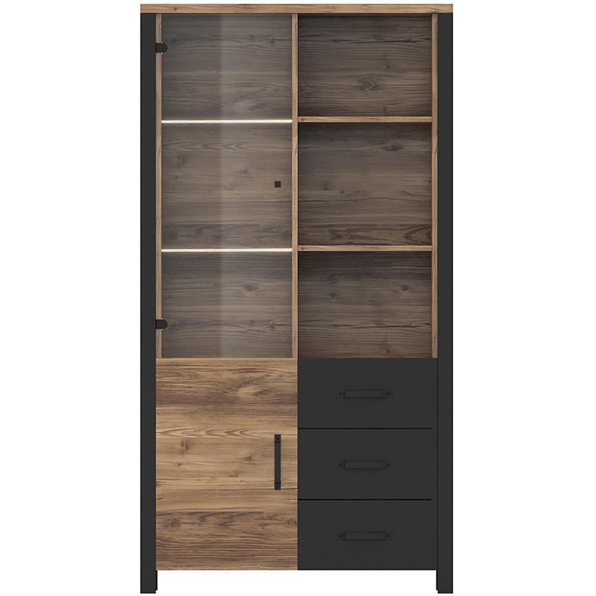 Witryna Olin zachwyca swoim minimalistycznym, loftowym designem. Kolor świerk appenzeller w połączeniu z czarnym supermatem nadaje wnętrzu niepowtarzalnego kontrastu, który przyciąga uwagę i dodaje charakteru. To idealne połączenie, które pasuje do różnych aranżacji wnętrz. Witryna została wykonana z trwałej płyty wiórowej laminowanej o matowym wykończeniu, co zapewnia jej solidność i długotrwałość. Konstrukcja jest stabilna, a wykończenie matowe nadaje jej elegancji.